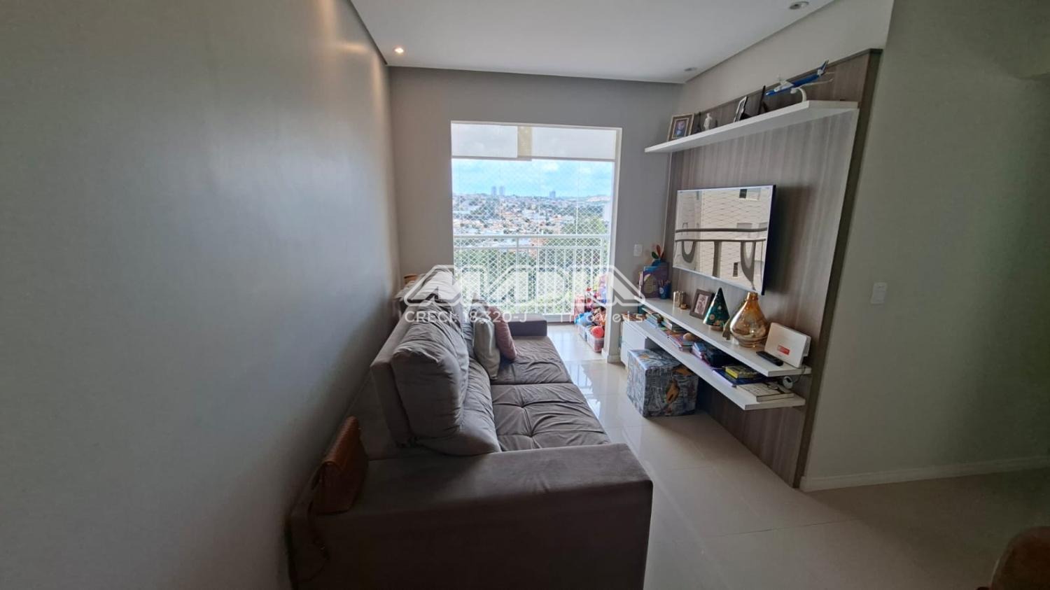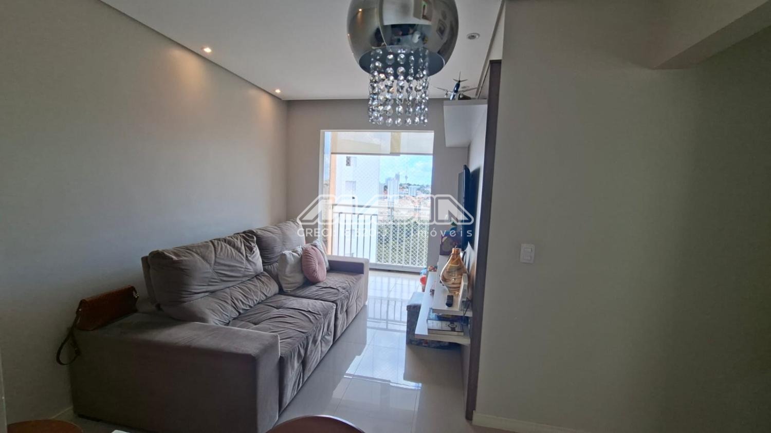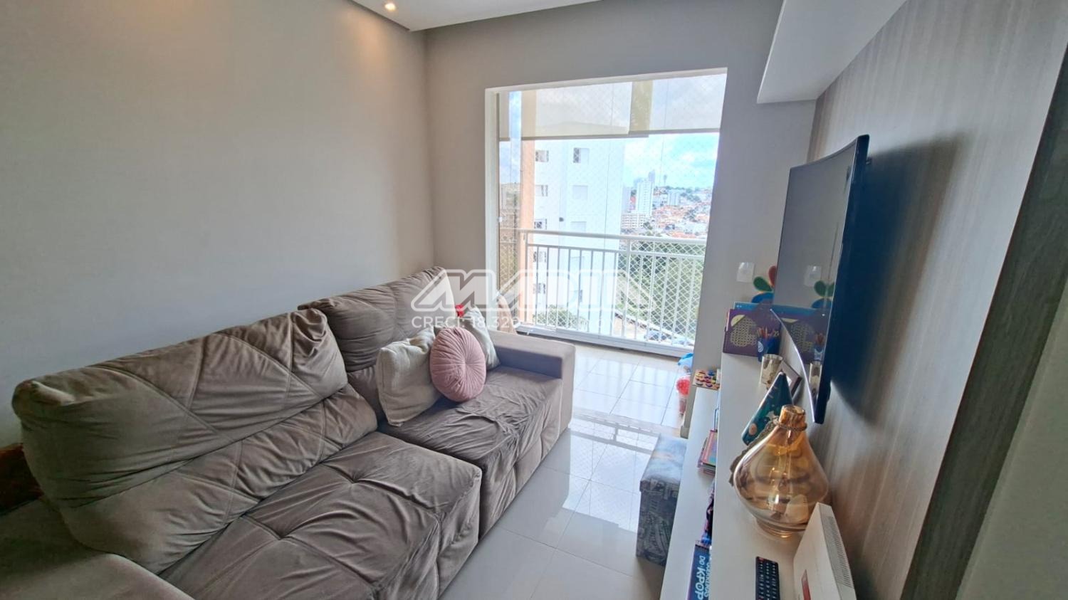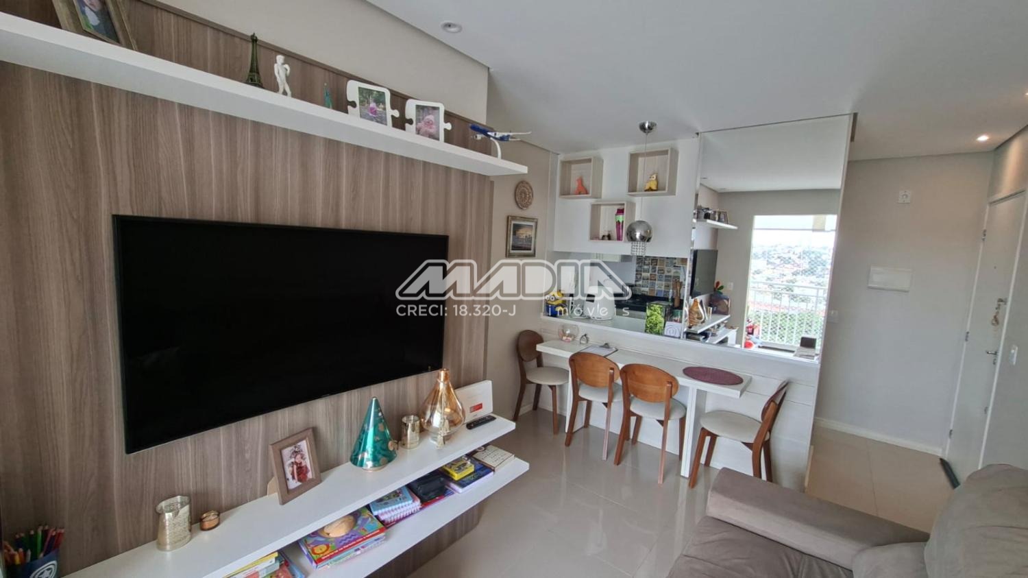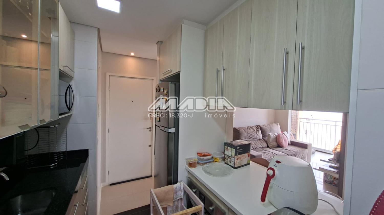 Apartamento com sala de jantar e tv, varanda integrada com fechamento em vidro, cozinha com armários planejados, forno elétrico, cooktop, coifa. 3 quartos sendo 2 com armários planejados.