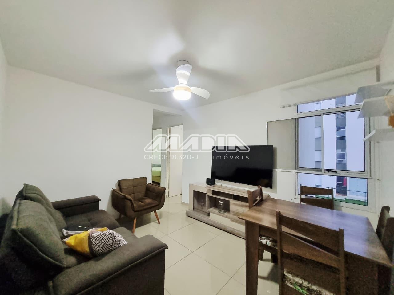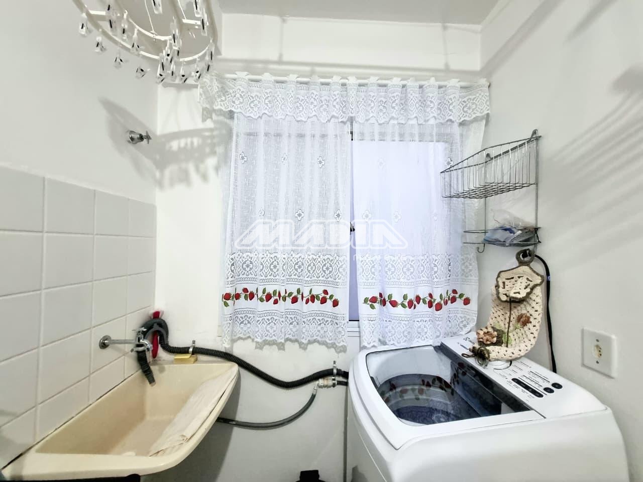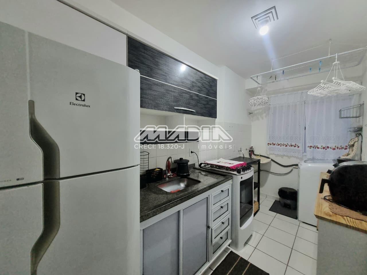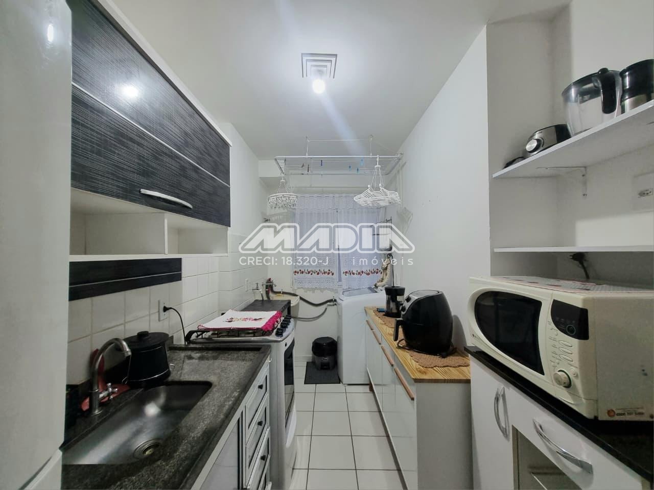 Apartamento de 43,50m², 2 dormitórios, sendo 1 dormitório com armário e cama, 1 dormitório com 2 camas e comoda, 1 banheiro social, sala dois ambientes com sofá, painel, TV e mesa de jantar, cozinha com armários, geladeira, fogão, micro-ondas, utensílios, área de serviço com máquina de lavar, 1 garagem coberta, sem elevador, aceita pet.