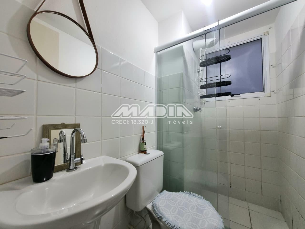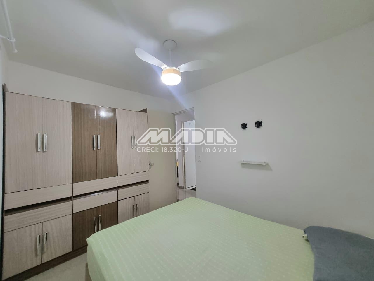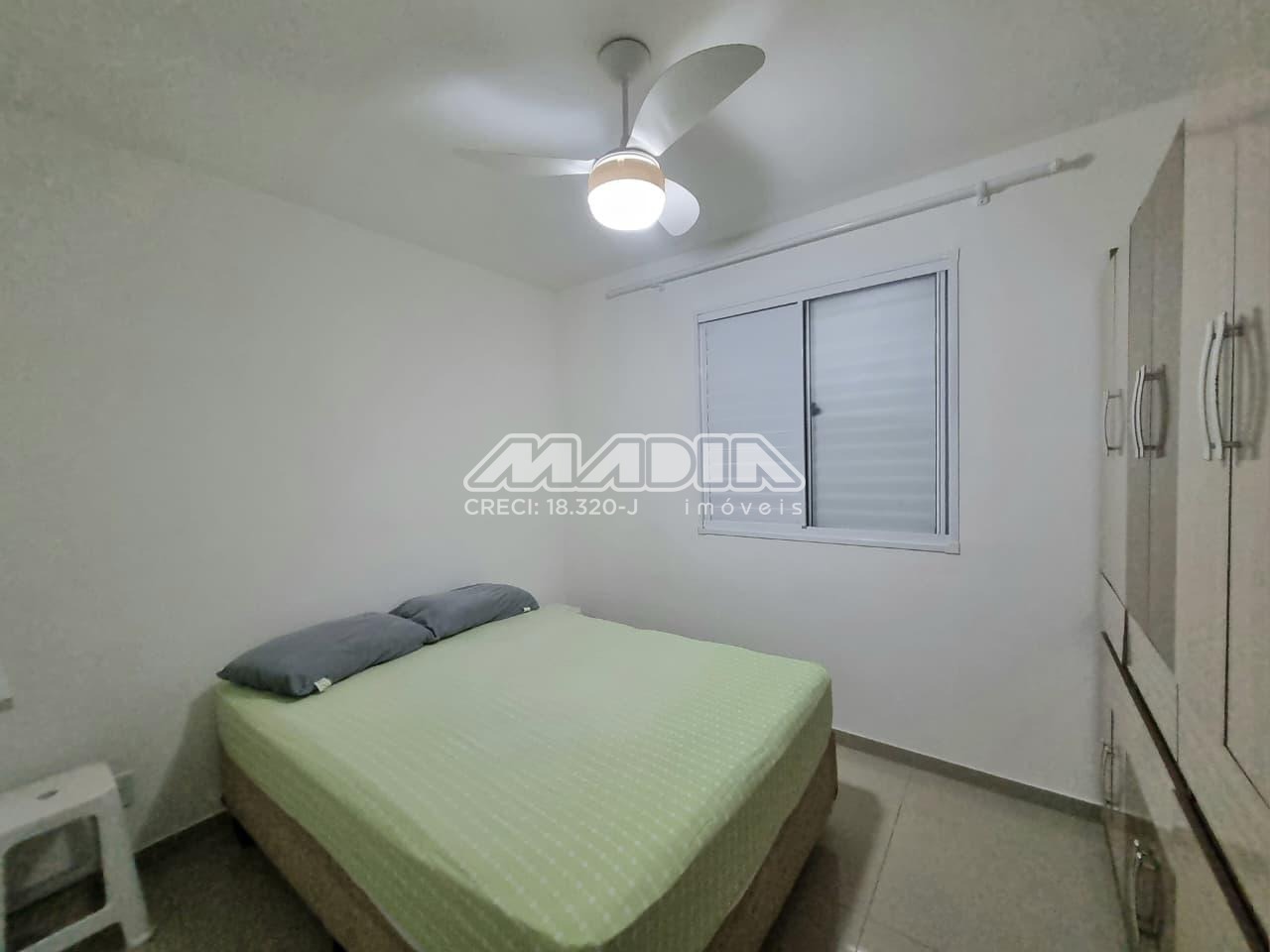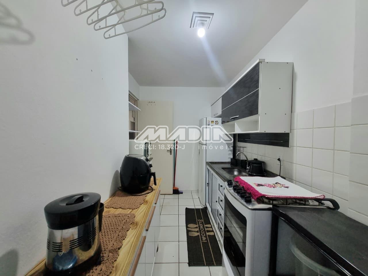 Apartamento de 43,50m², 2 dormitórios, sendo 1 dormitório com armário e cama, 1 dormitório com 2 camas e comoda, 1 banheiro social, sala dois ambientes com sofá, painel, TV e mesa de jantar, cozinha com armários, geladeira, fogão, micro-ondas, utensílios, área de serviço com máquina de lavar, 1 garagem coberta, sem elevador, aceita pet.