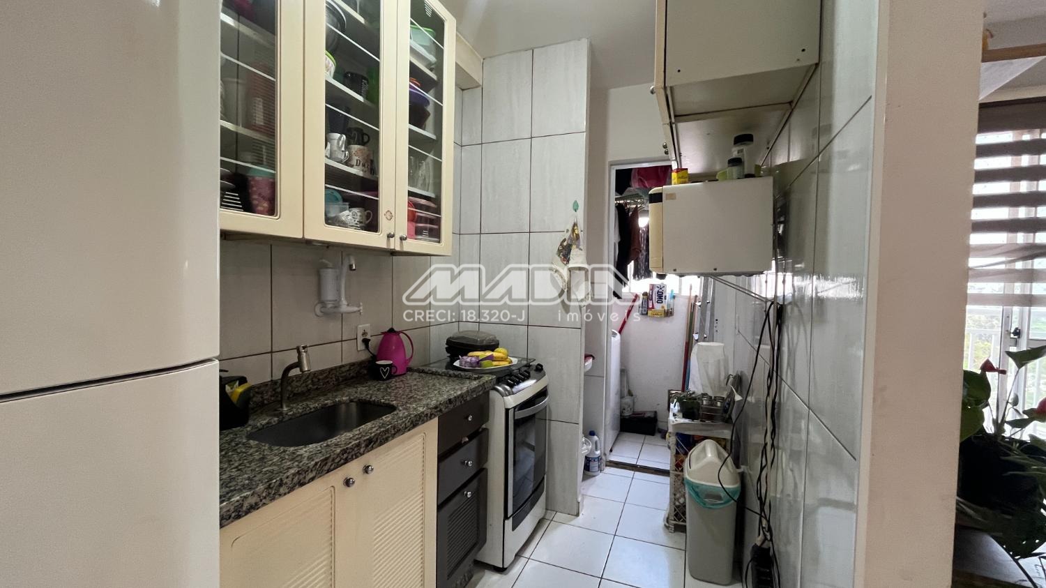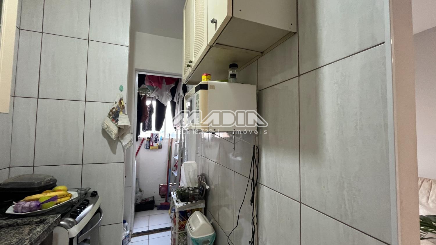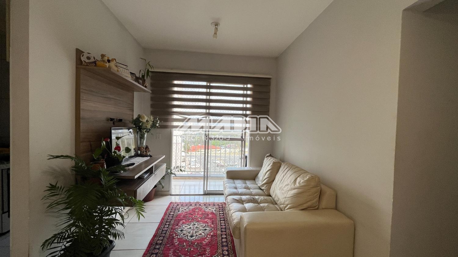 Apartamento com sala para dois ambientes com varanda aberta, banheiro, cozinha com armários, 2 quartos, área de serviço e um banheiro social.