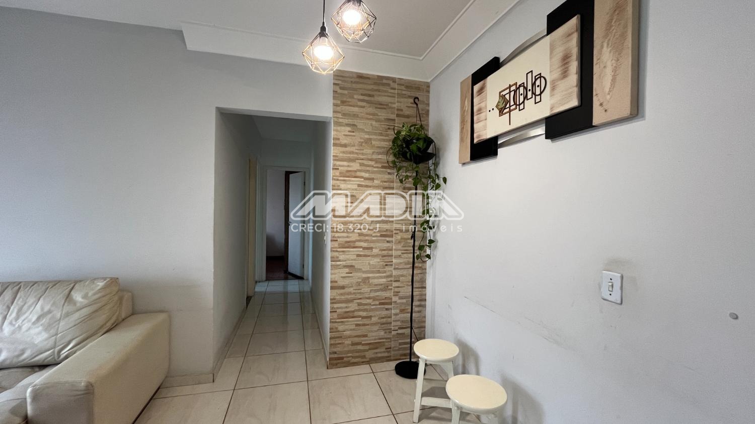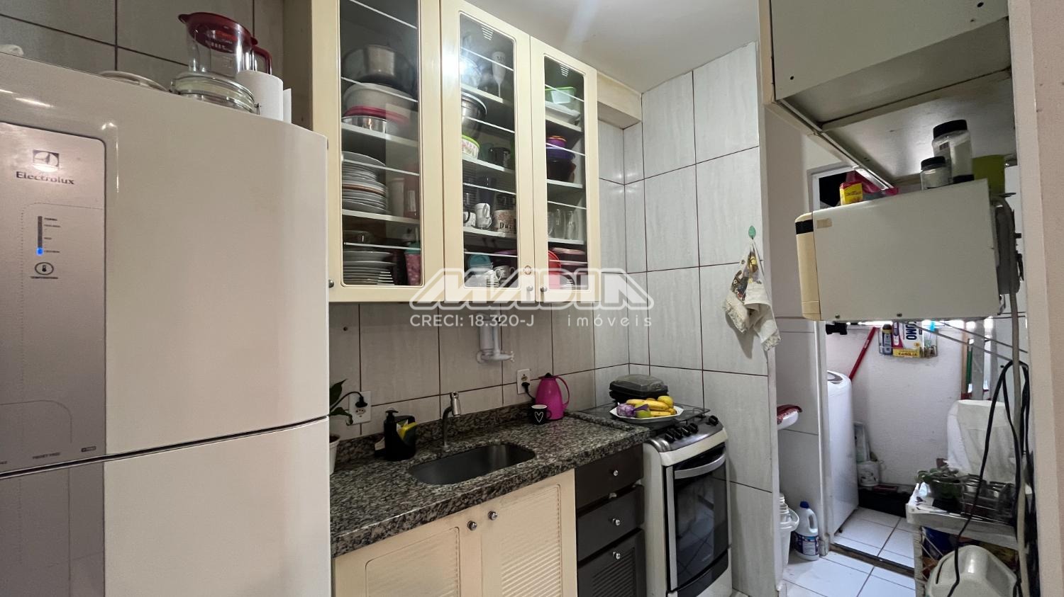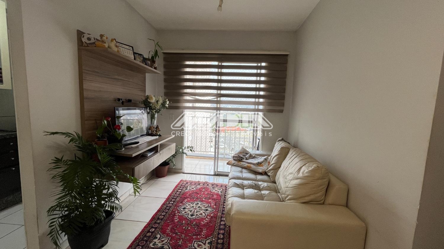 Apartamento com sala para dois ambientes com varanda aberta, banheiro, cozinha com armários, 2 quartos, área de serviço e um banheiro social.