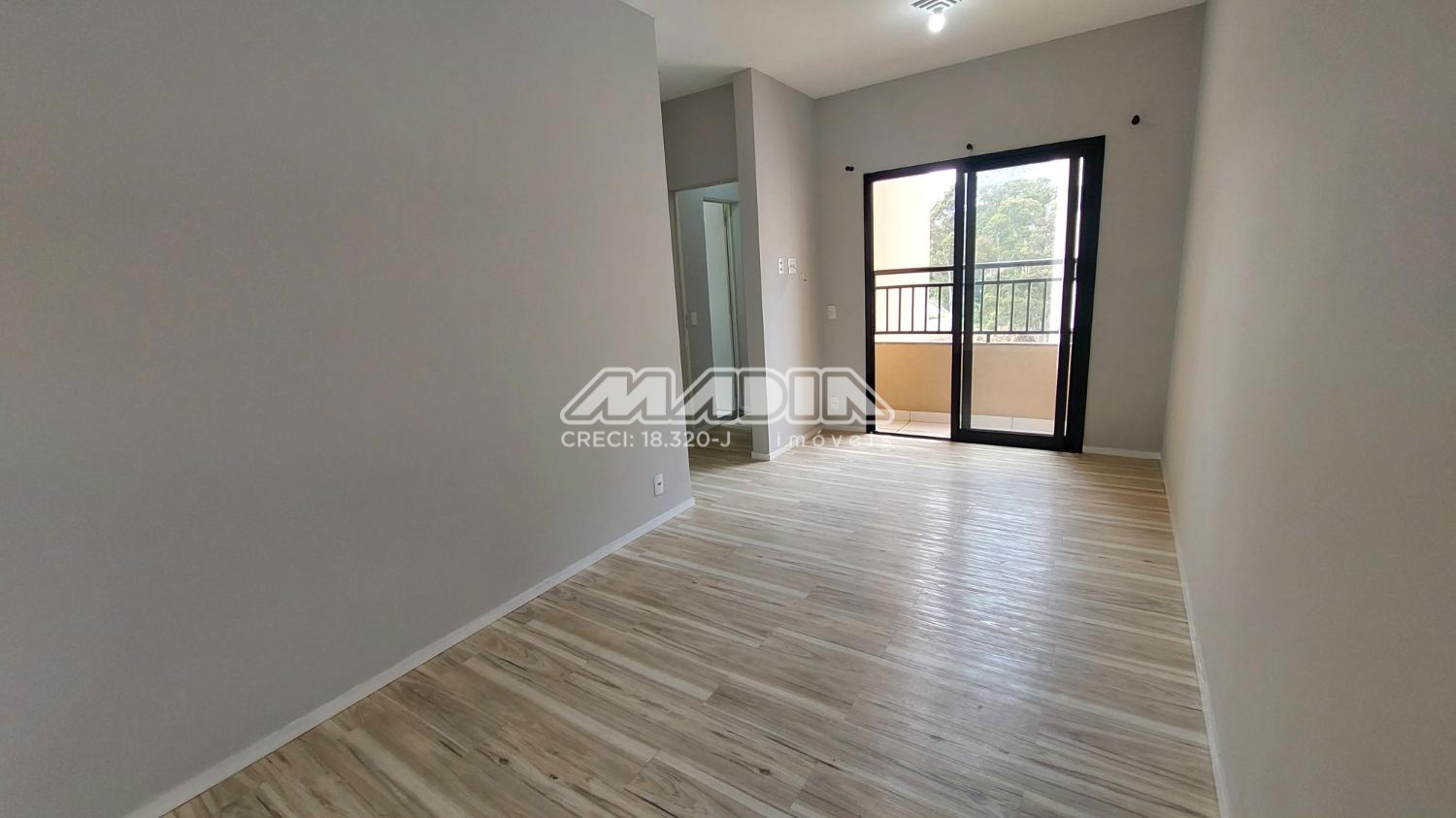A sala de estar e jantar integradas cria um ambiente agradável e iluminado, com acesso à sacada, ideal para momentos de descanso.
