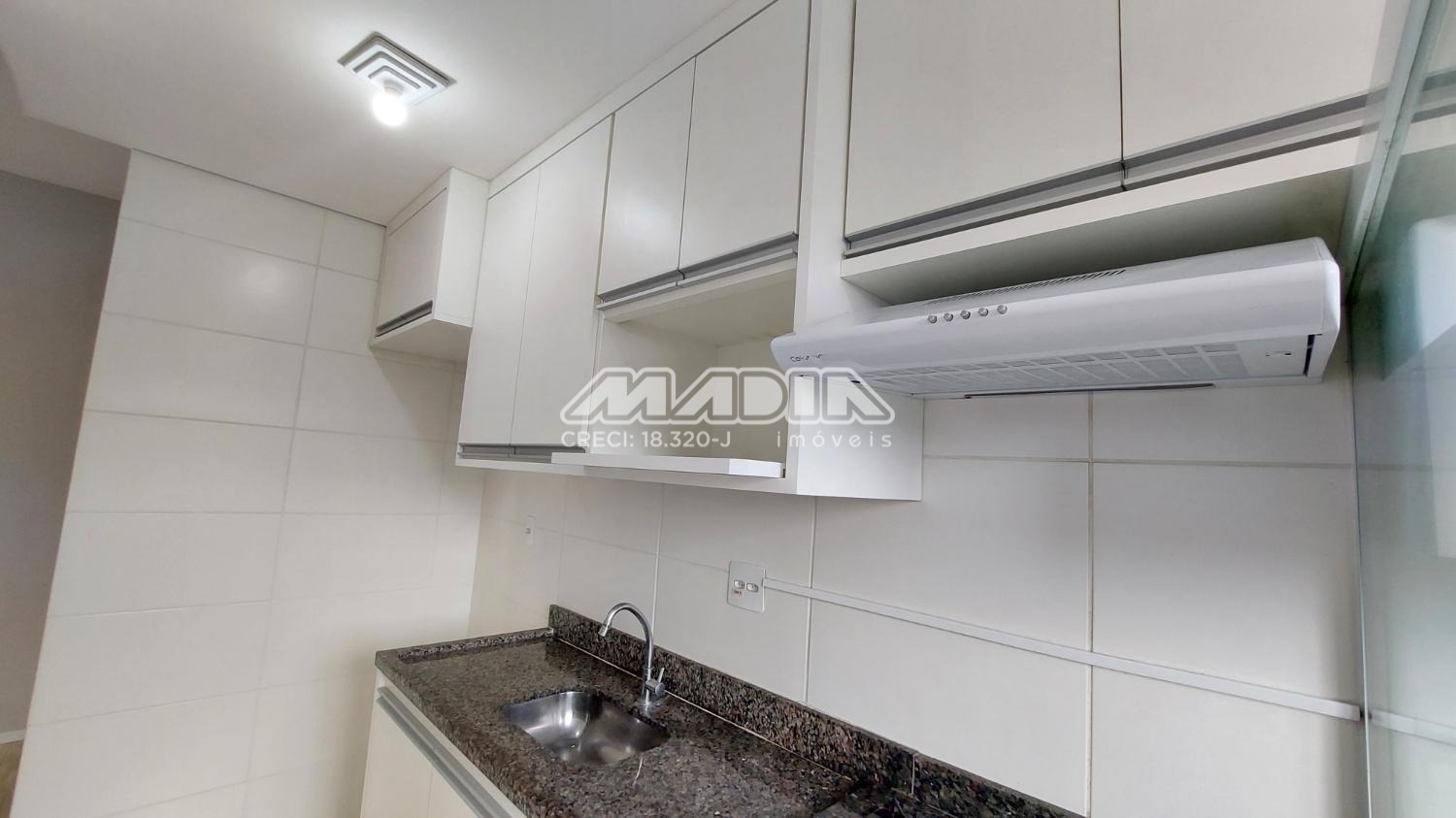 A cozinha é planejada, equipada com cooktop e exaustor, garantindo funcionalidade e bom aproveitamento do espaço.