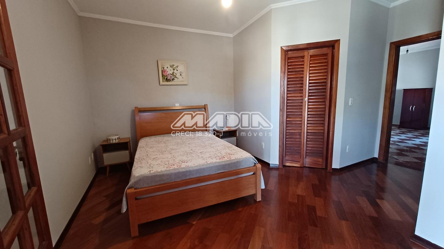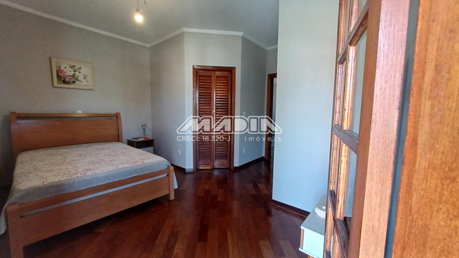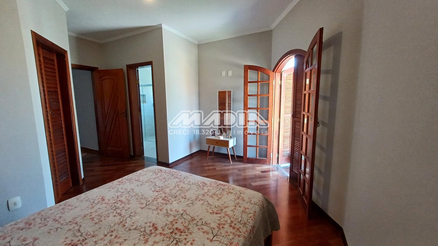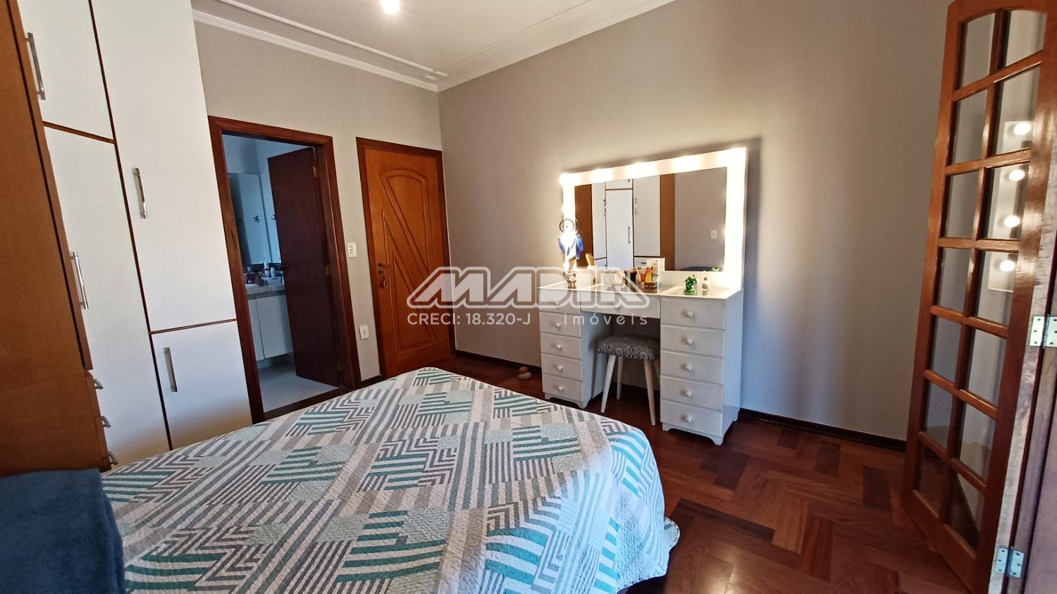 A residência é composta por quatro suítes com piso de madeira, oferecendo conforto e elegância.