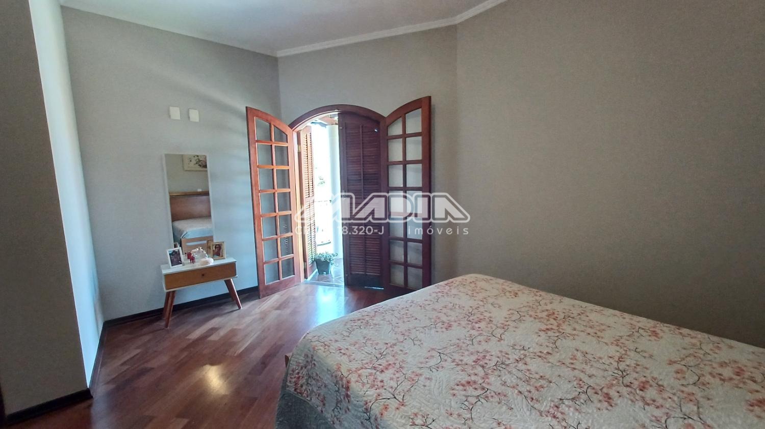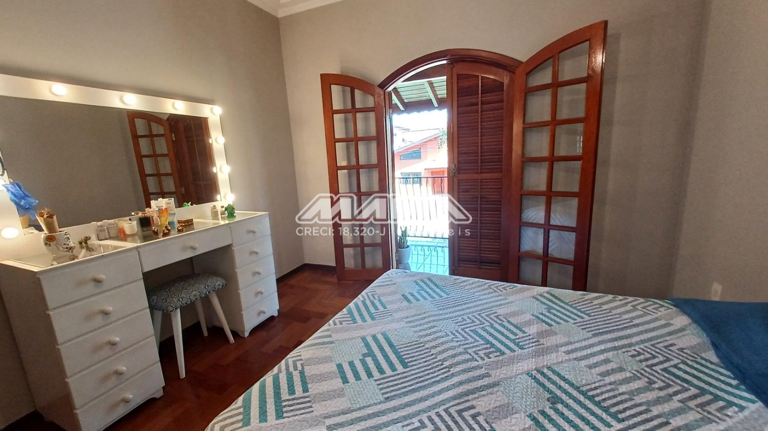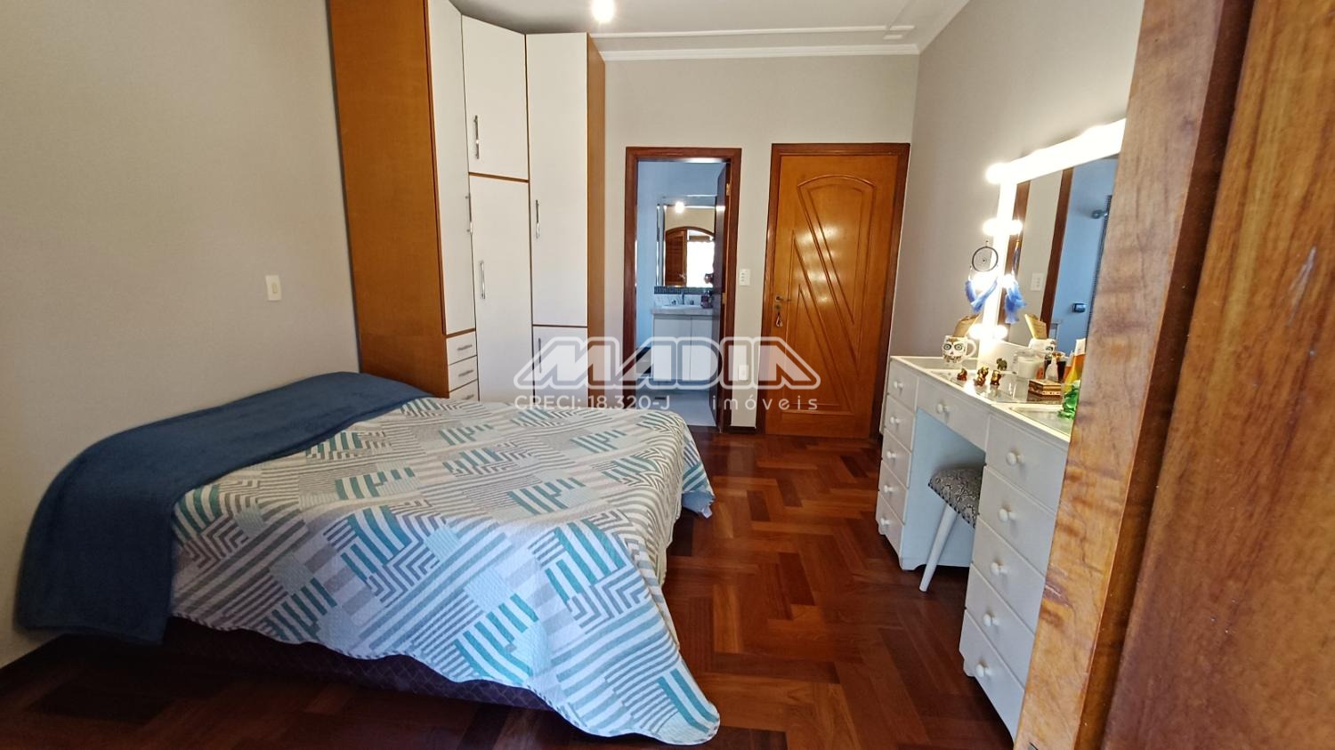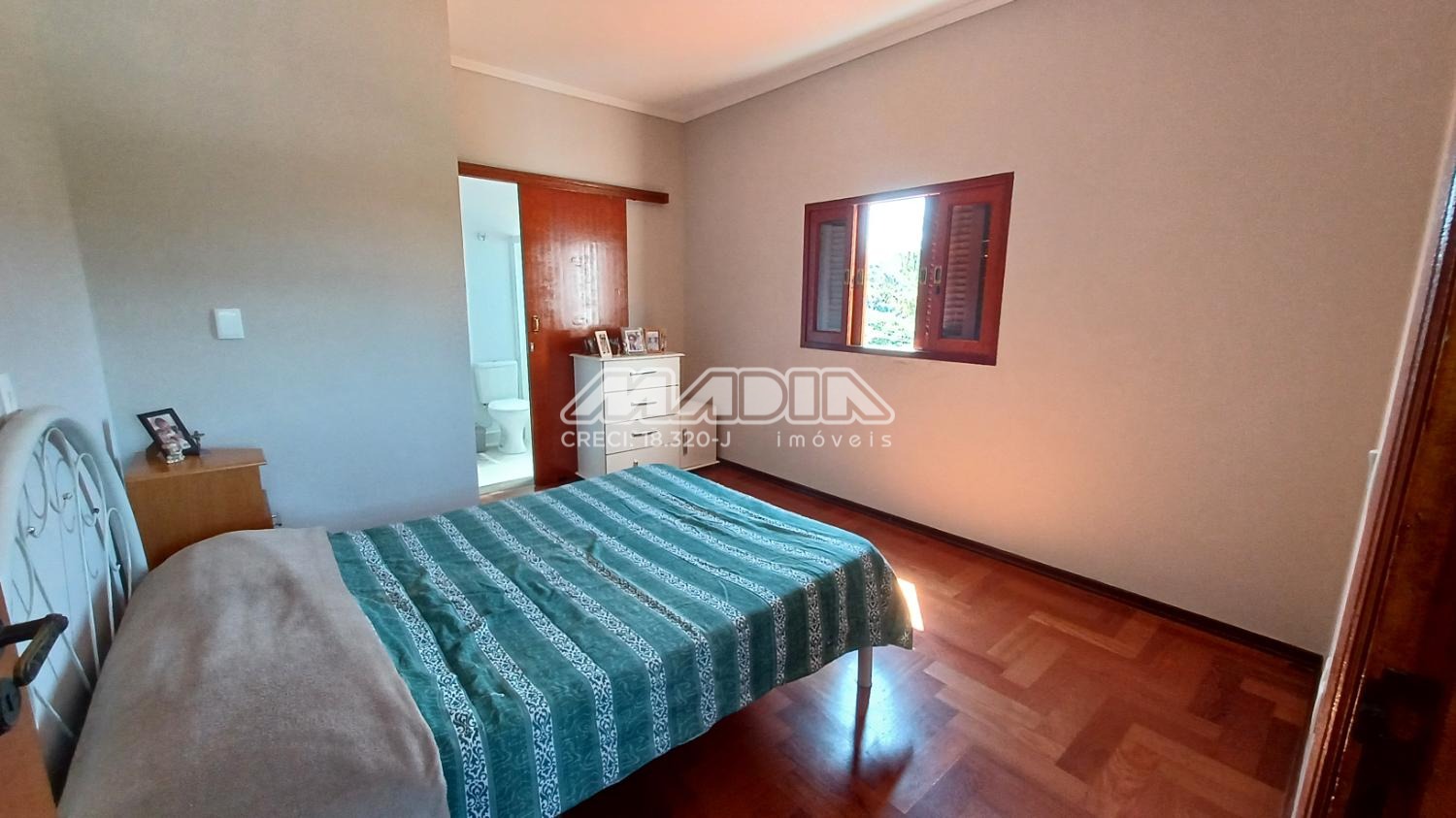 A residência é composta por quatro suítes com piso de madeira, oferecendo conforto e elegância.