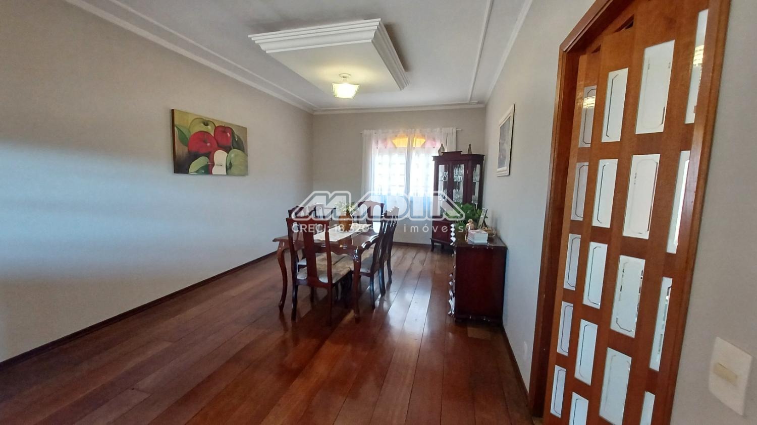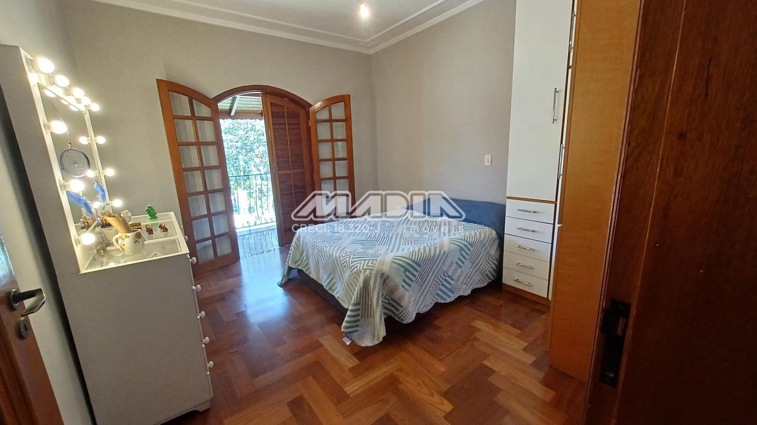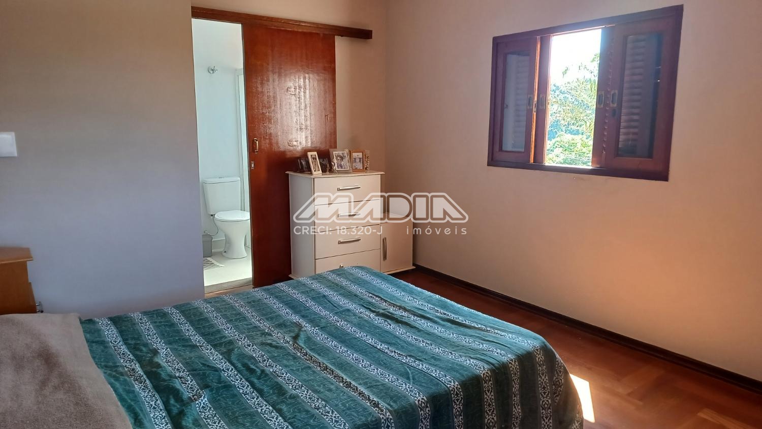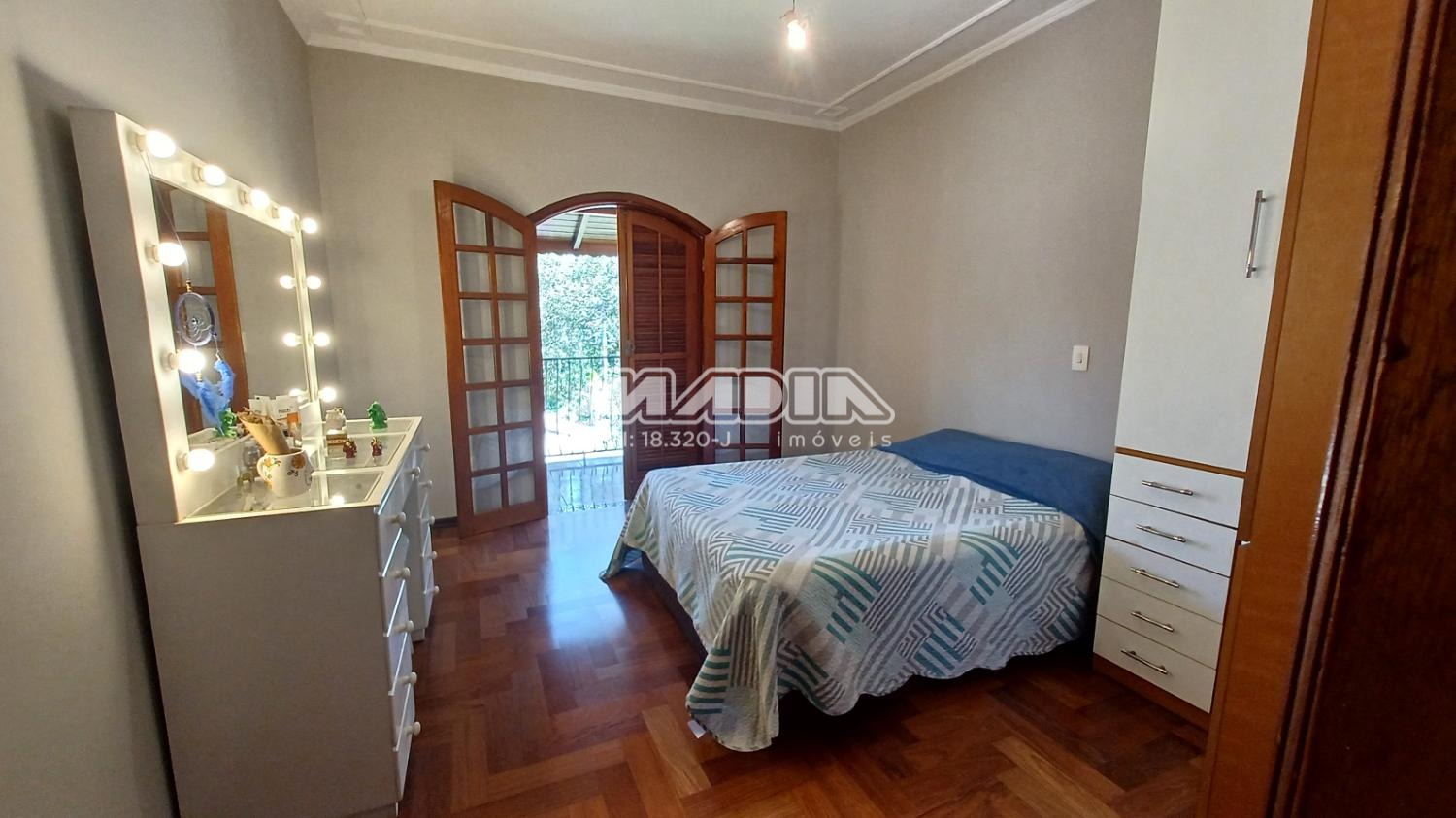 A residência é composta por quatro suítes com piso de madeira, oferecendo conforto e elegância.