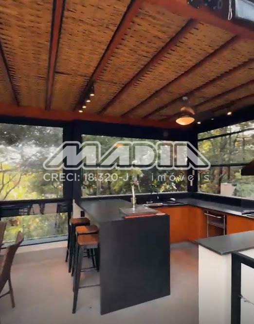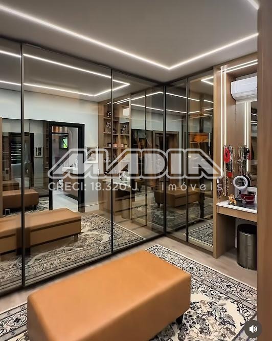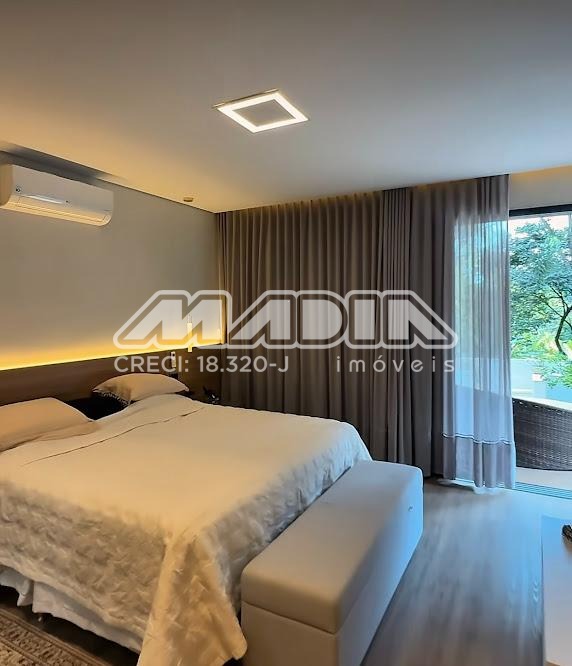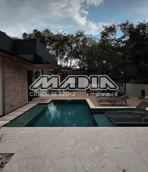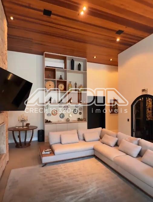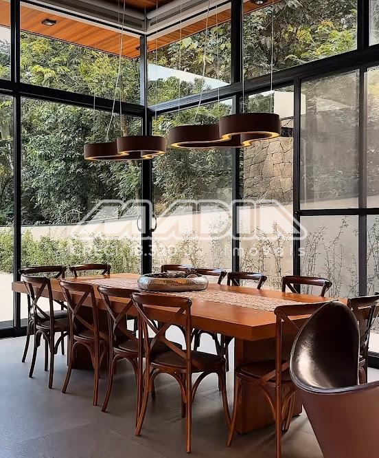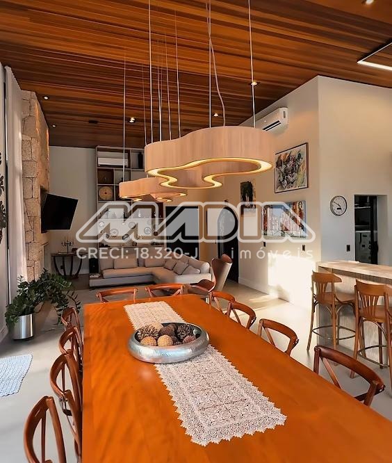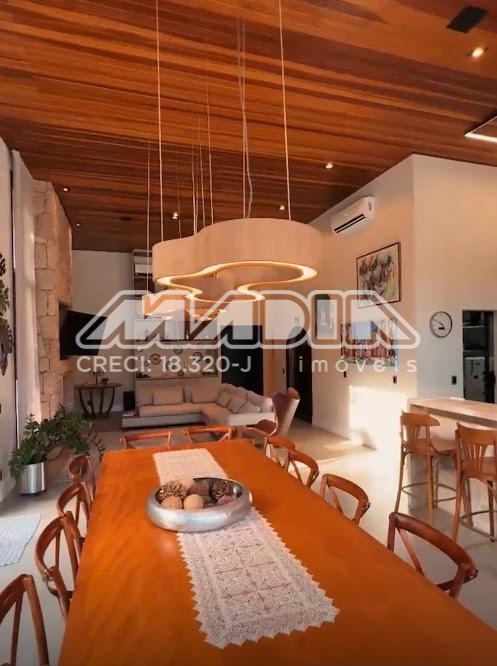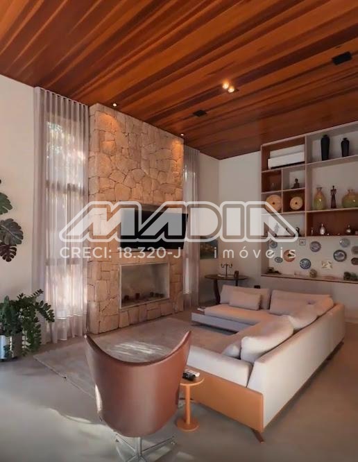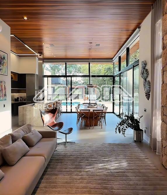 Casa térrea com 400m² de construção e 1.000m² de terreno, com 4 suítes, sendo a máster com closet, e todos as outras suítes com armários, sala de estar com lareira, sala de jantar, em um ambiente amplo, pé direito alto, escritório privado, home theater/cinema, banheiro social, lavanderia com armários, área de lazer com piscina, churrasqueira.