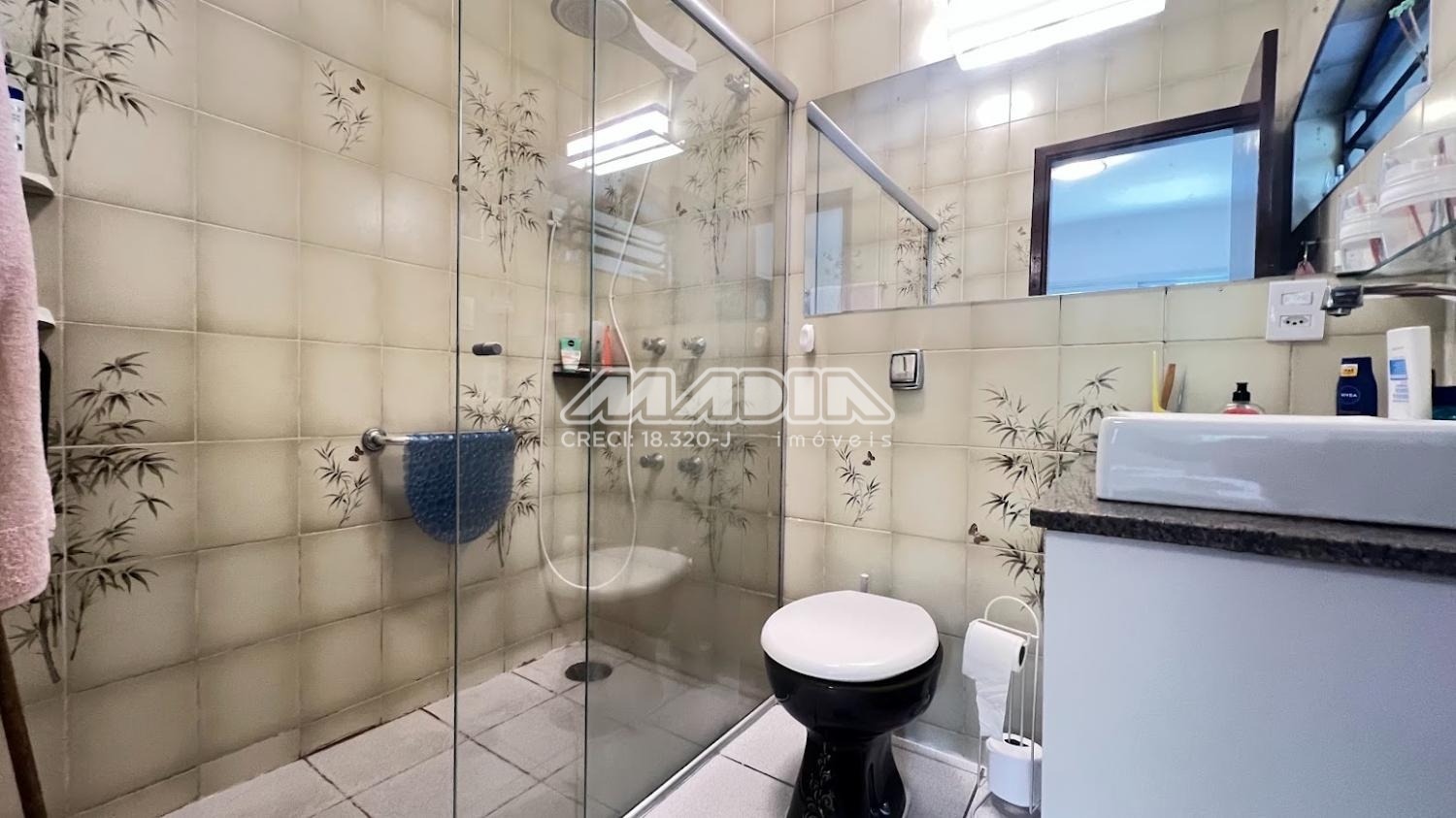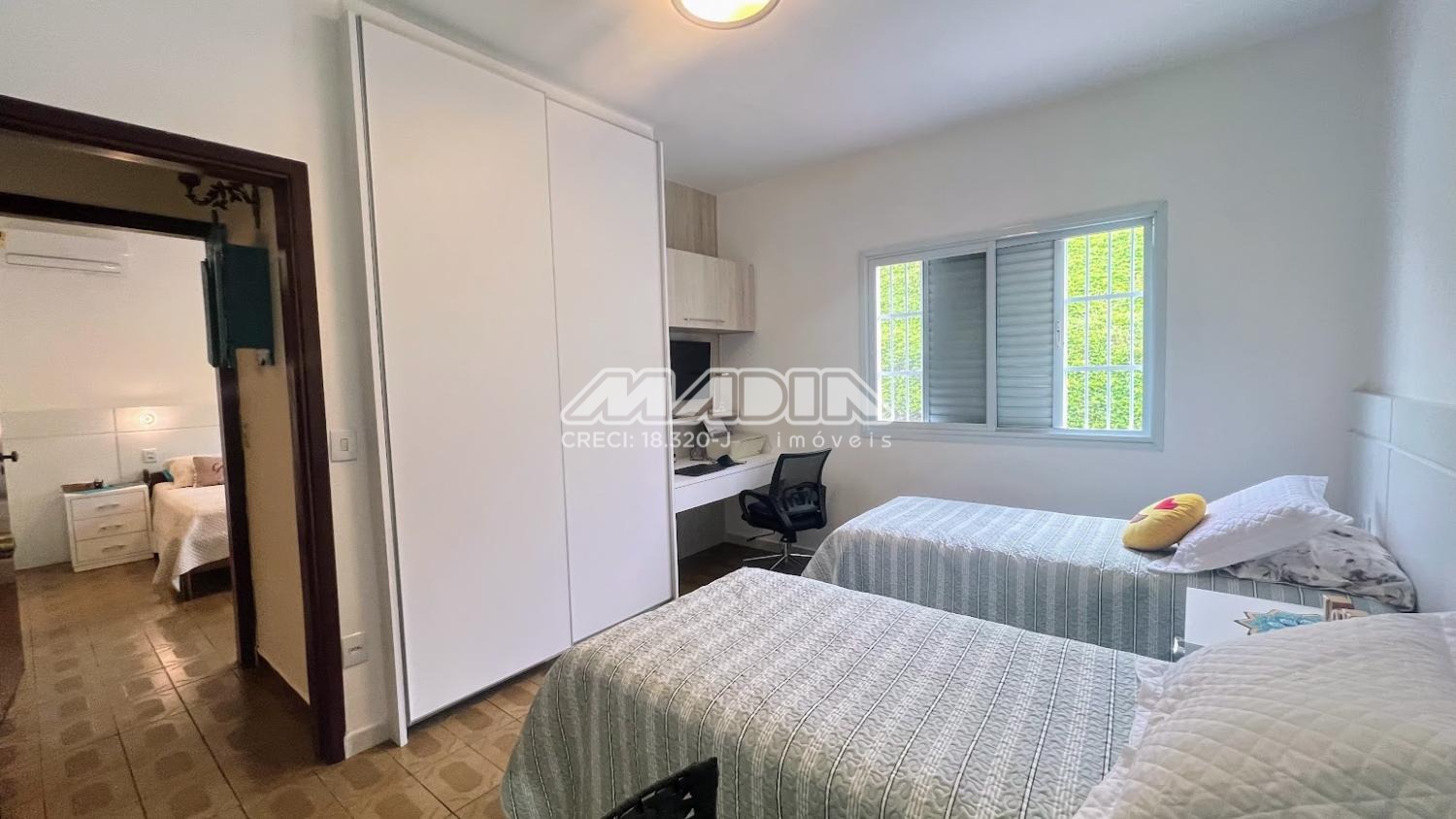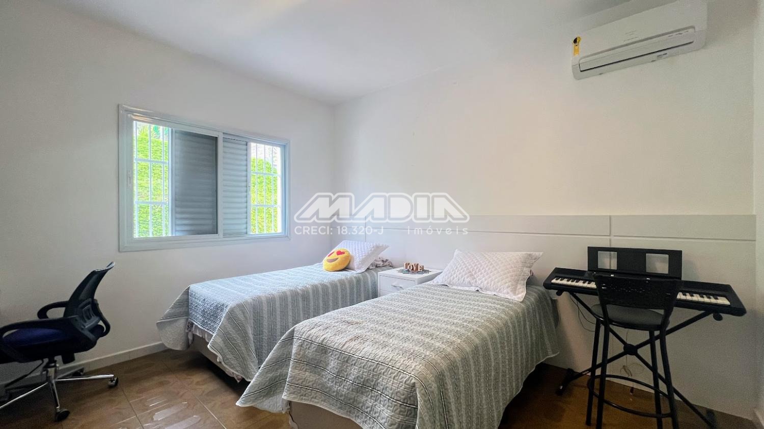 Área de serviço tem portas de correr em alumínio e vidro. Todos os cômodos são protegidos por telas mosqueteiras e têm ar condicionado, tipo split.