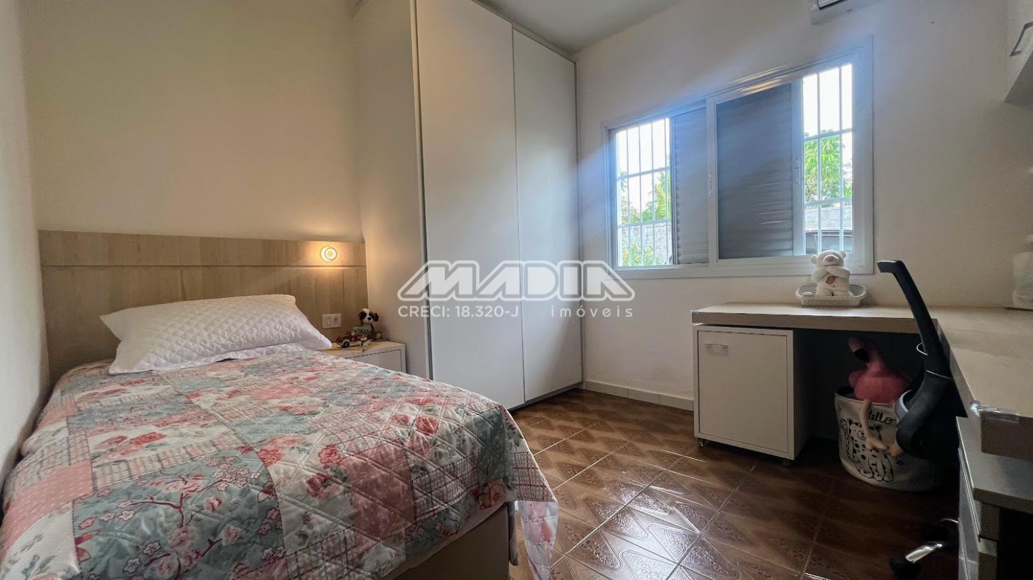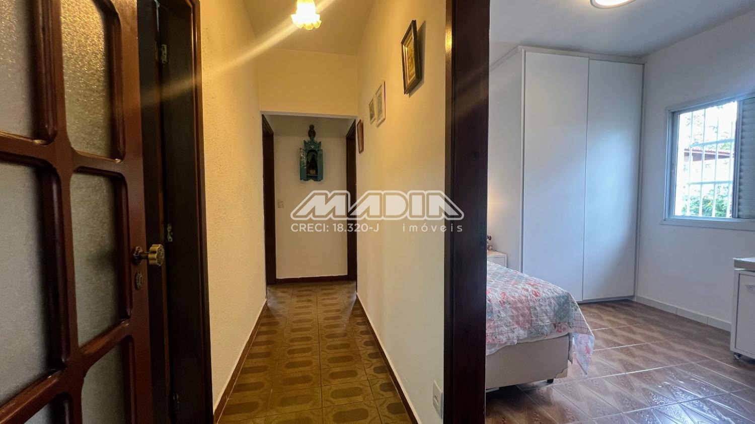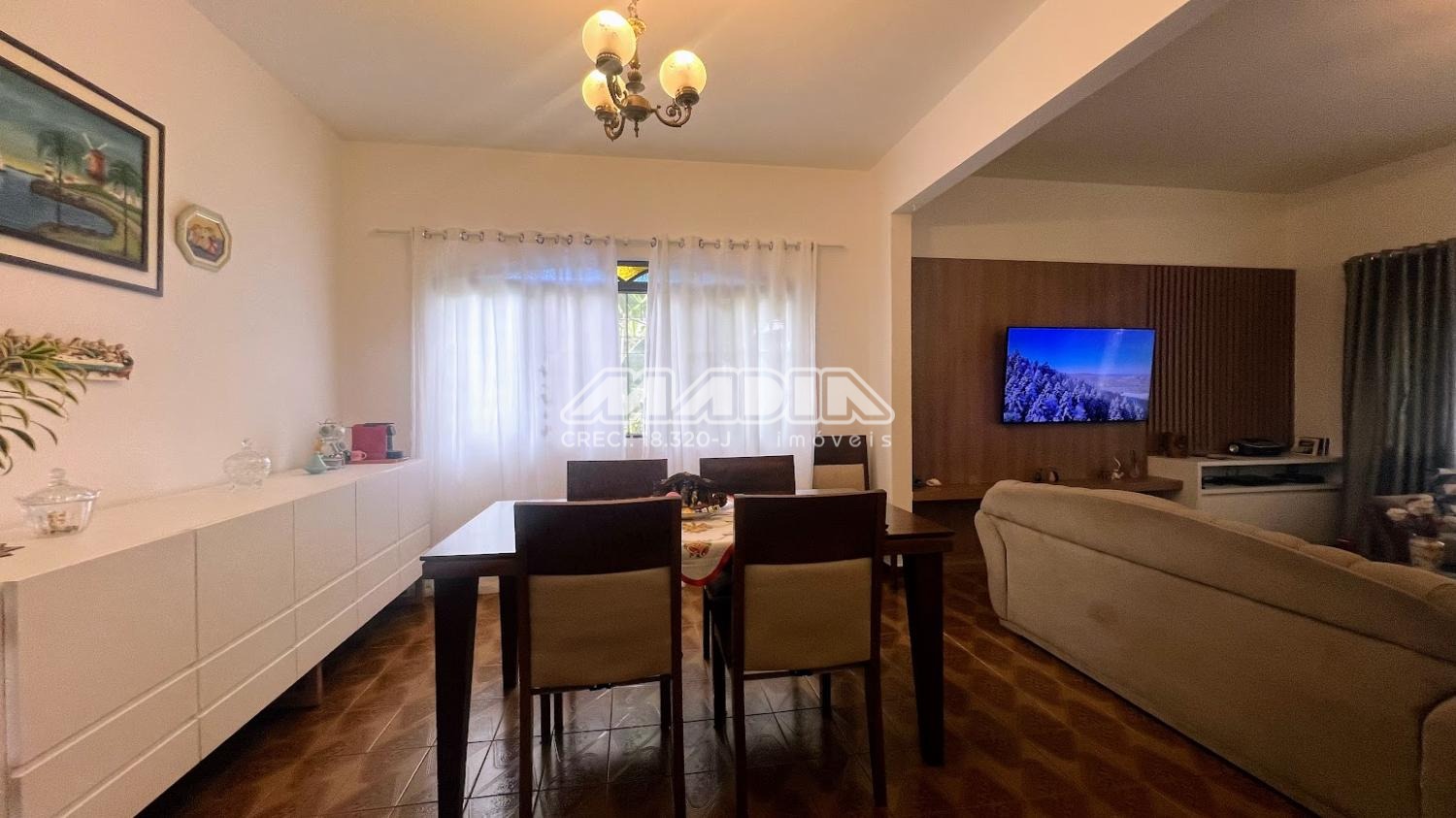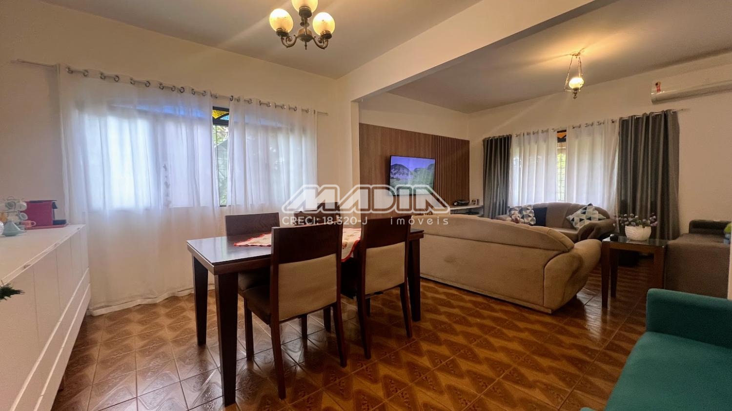 São 3 dormitórios, sendo 1 suíte, amplo living com 3 salas, banheiro social, cozinha, área de serviço, garagem e terraço. As janelas dos dormitórios são de alumínio, com 1,65 m e tem grades. Os janelões da sala são de chapa dobrada, também com grades.