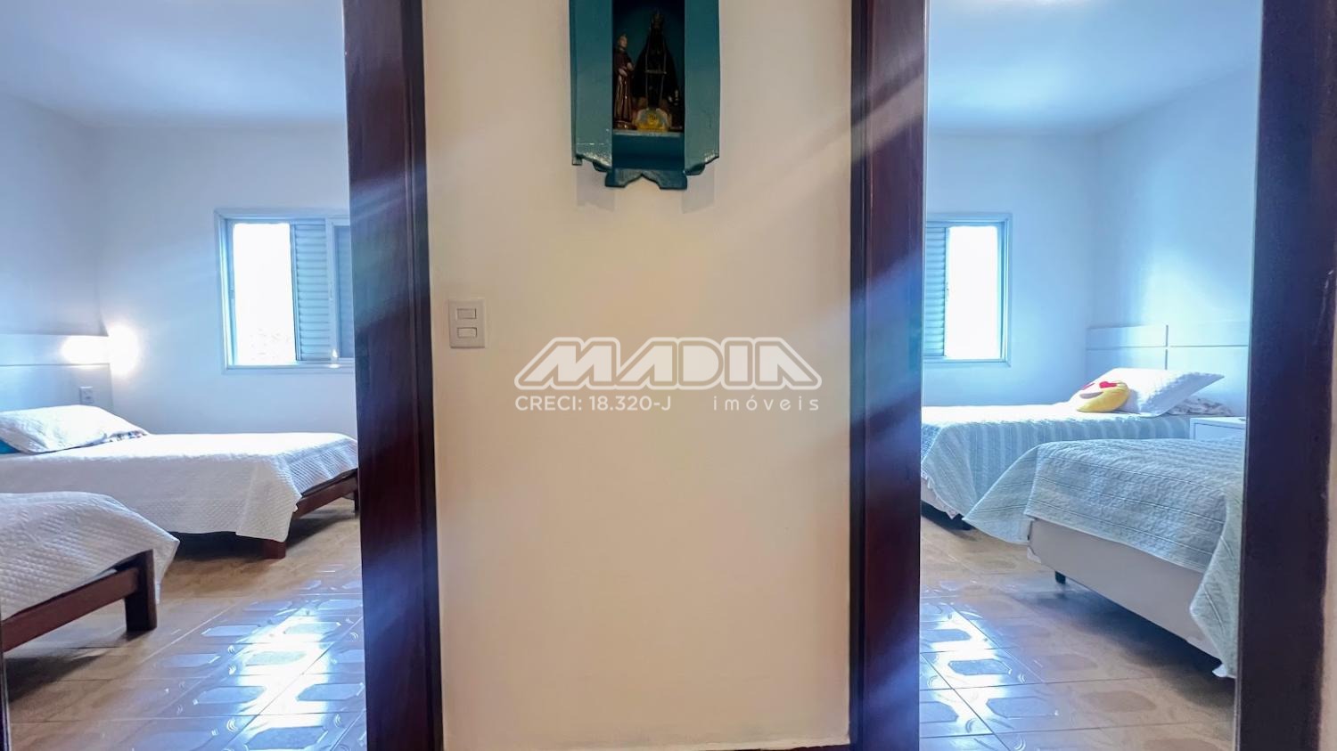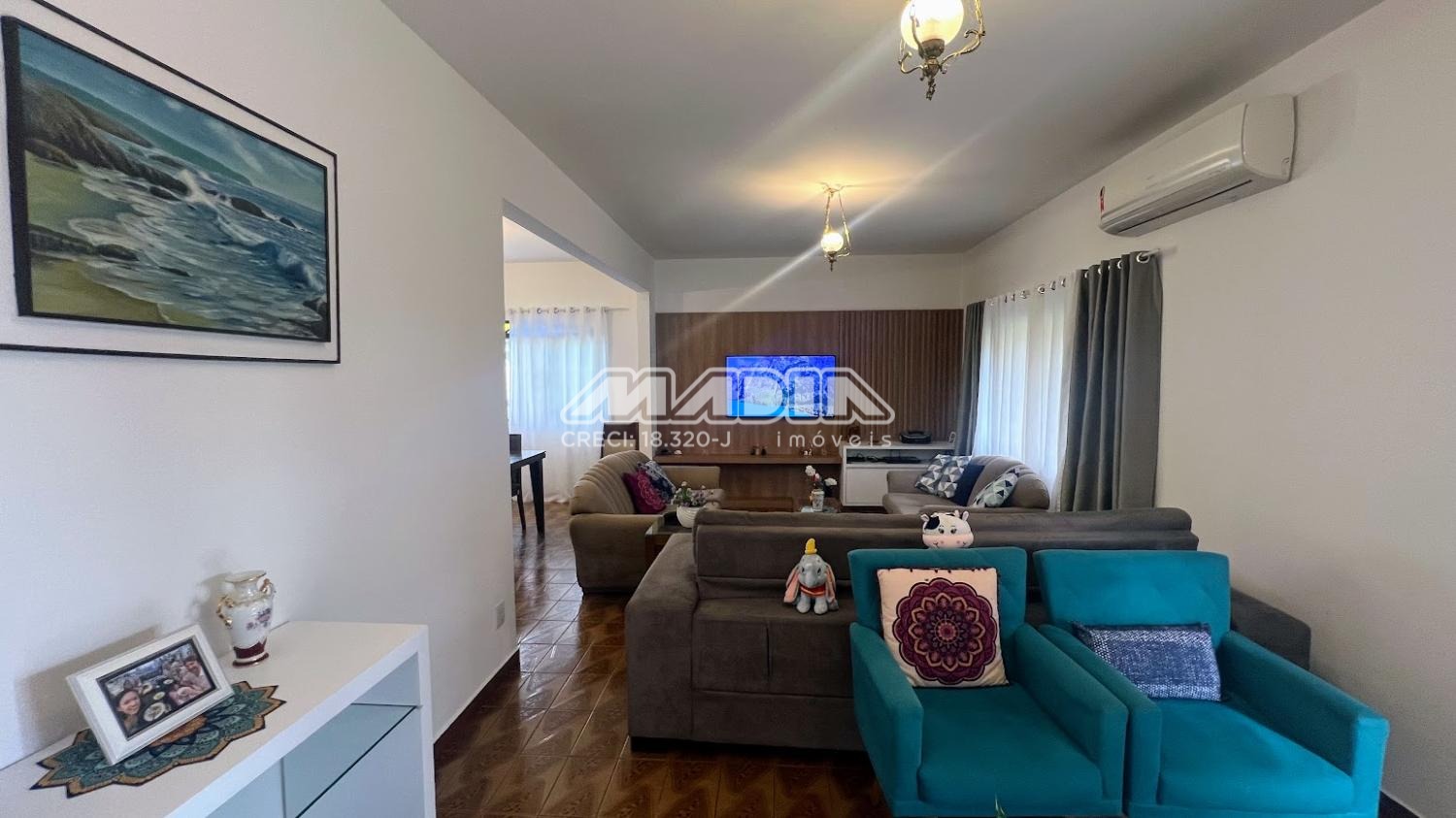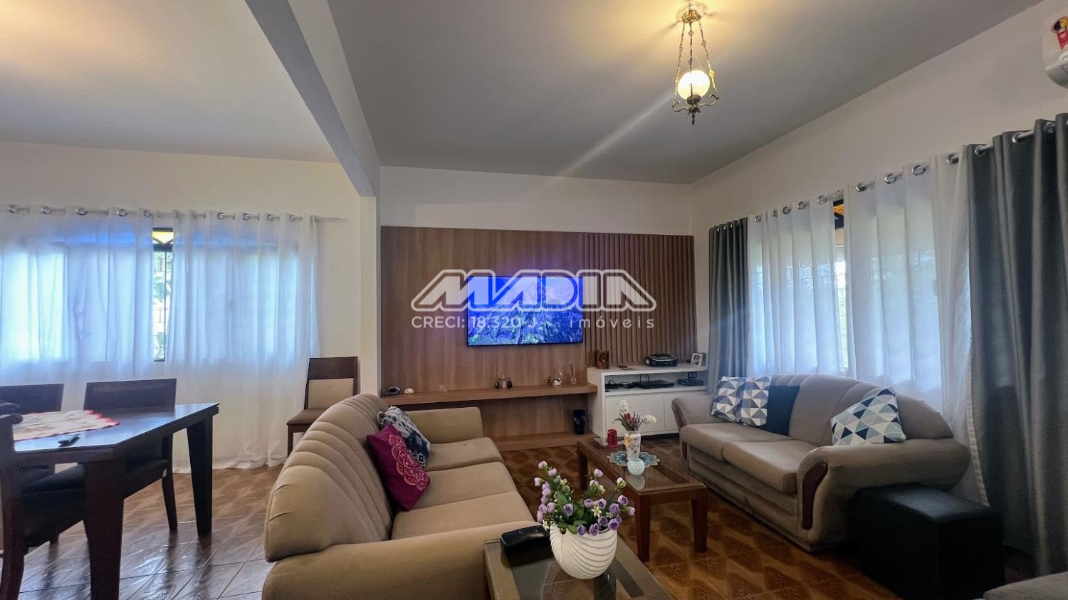 São 3 dormitórios, sendo 1 suíte, amplo living com 3 salas, banheiro social, cozinha, área de serviço, garagem e terraço. As janelas dos dormitórios são de alumínio, com 1,65 m e tem grades. Os janelões da sala são de chapa dobrada, também com grades.