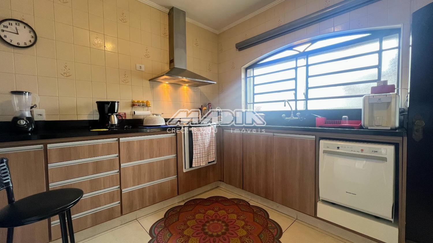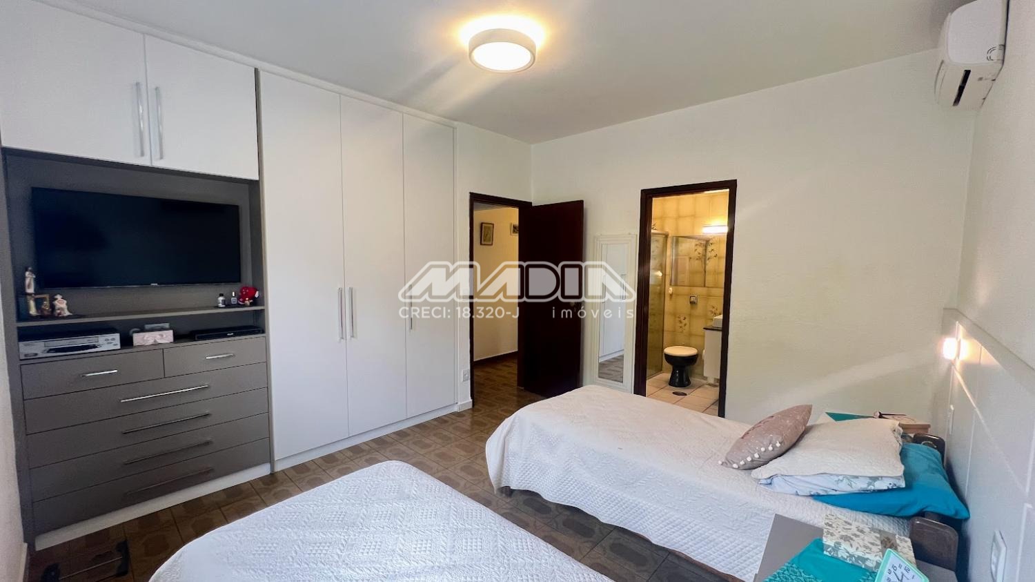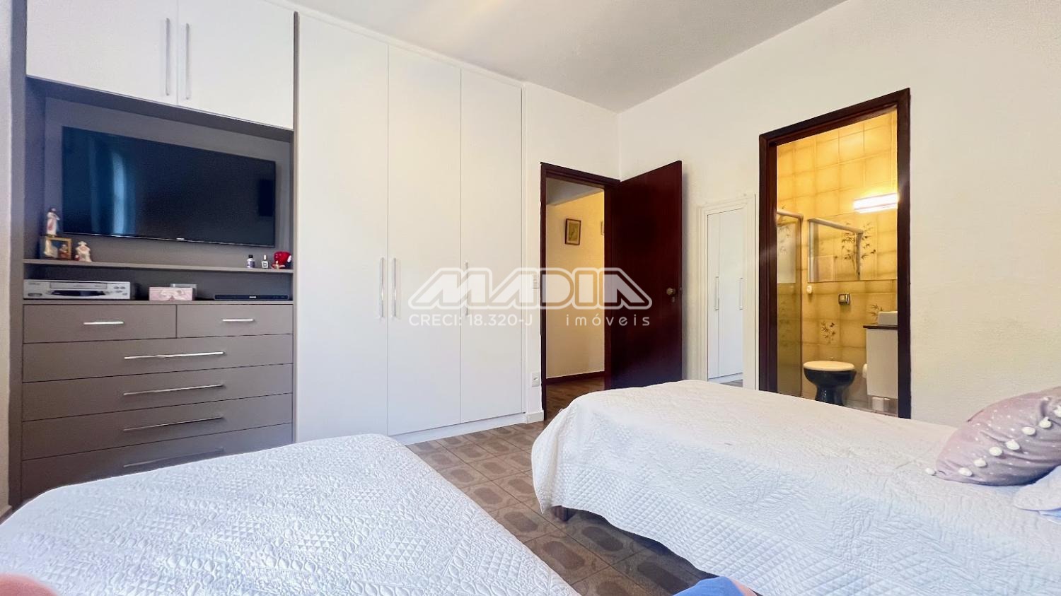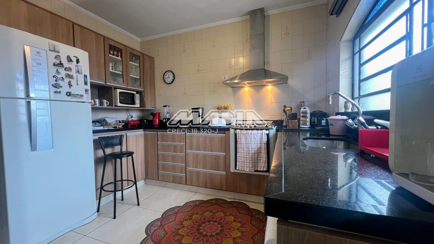 São 3 dormitórios, sendo 1 suíte, amplo living com 3 salas, banheiro social, cozinha, área de serviço, garagem e terraço. As janelas dos dormitórios são de alumínio, com 1,65 m e tem grades. Os janelões da sala são de chapa dobrada, também com grades.