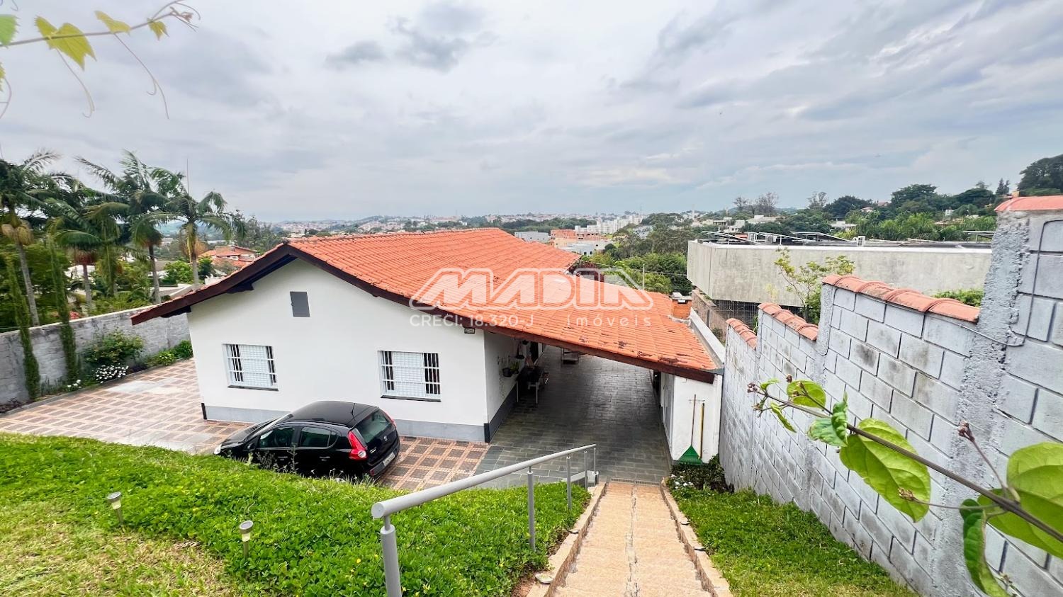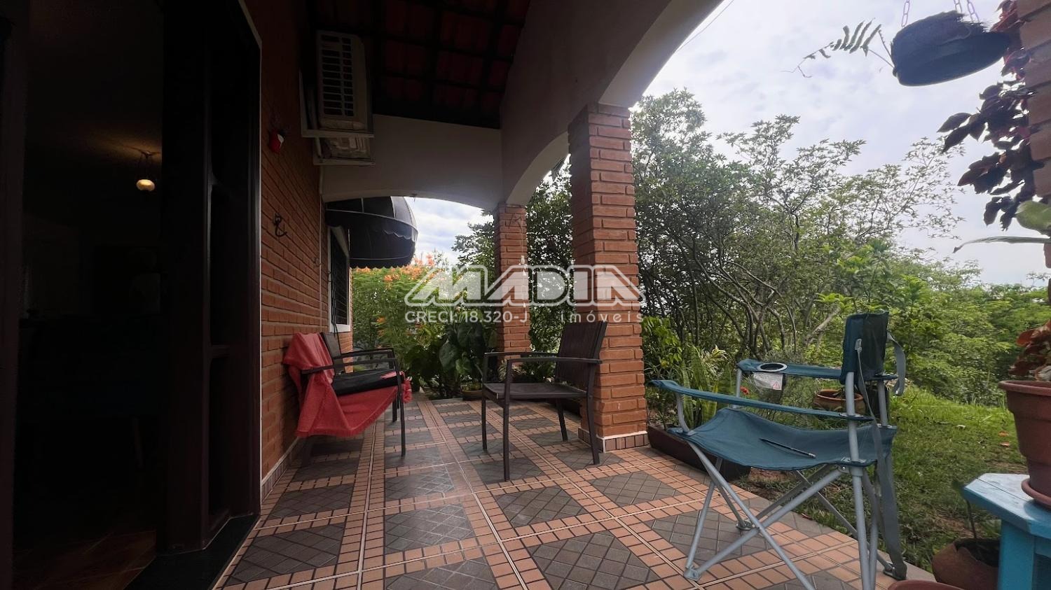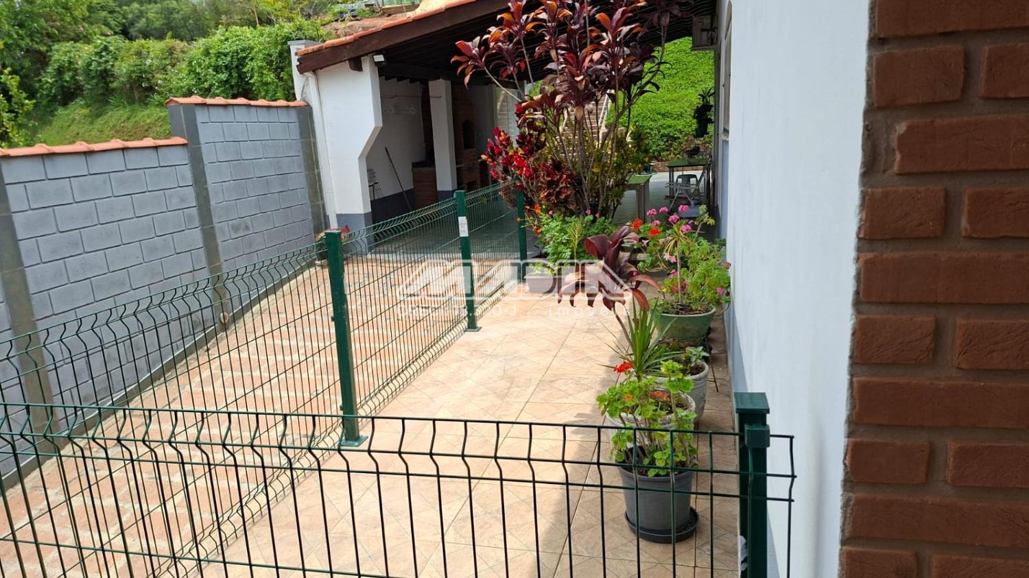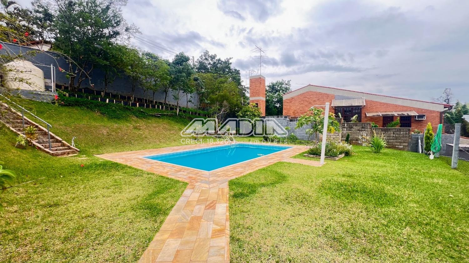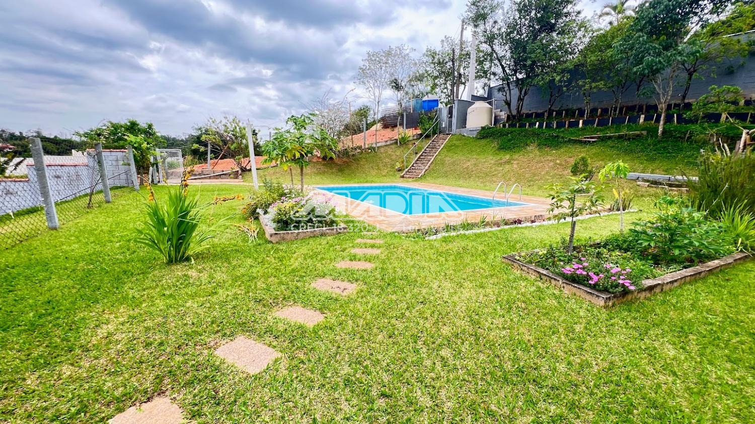 A casa é acessada por rampa toda revestida com blocos de pedra. No nível superior fica a piscina em alvenaria e cerâmica (4 m x 7 m e 1,40 de profundidade) com acesso por escada também revestida por blocos de pedra. Em estilo colonial, tem construção impecável e toda com móveis planejados.