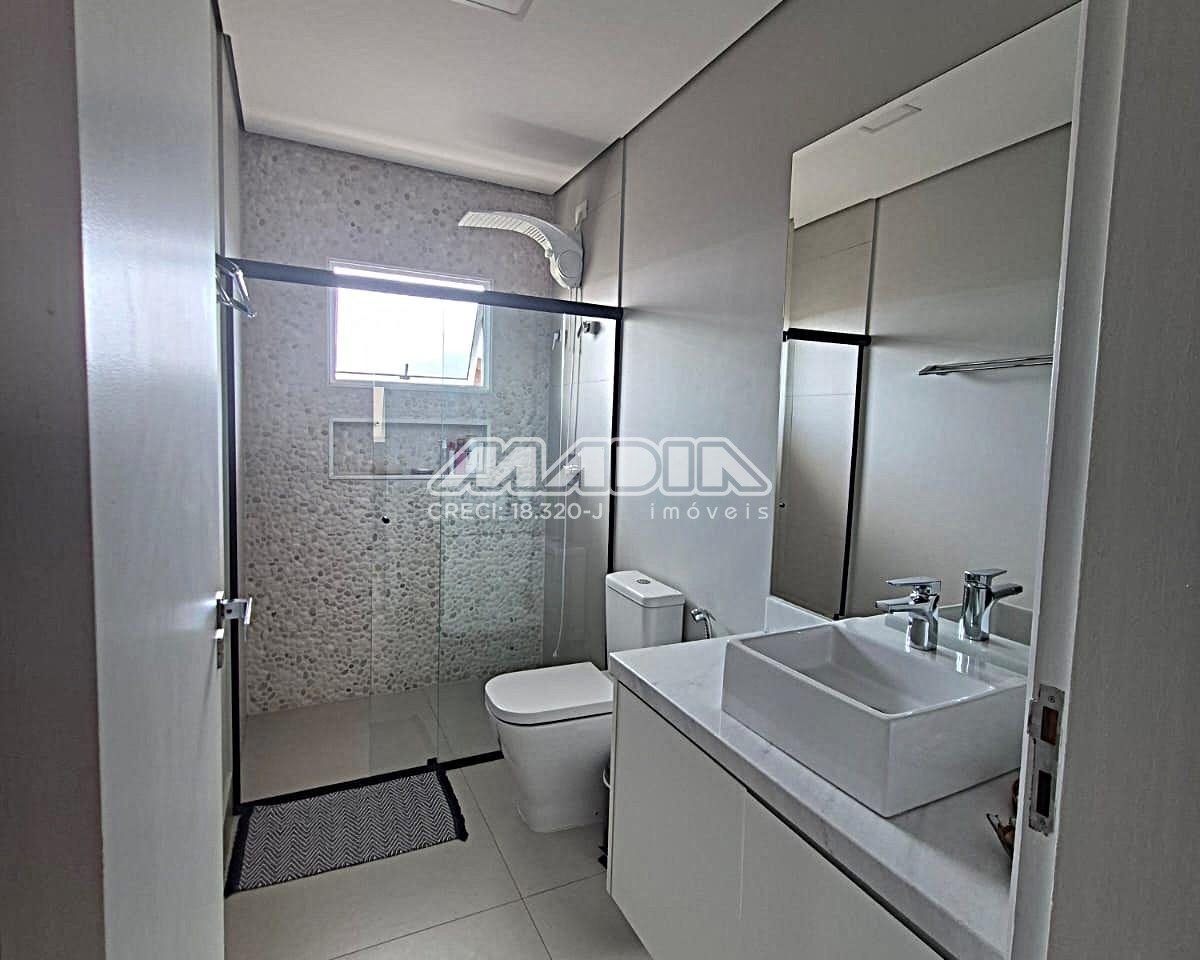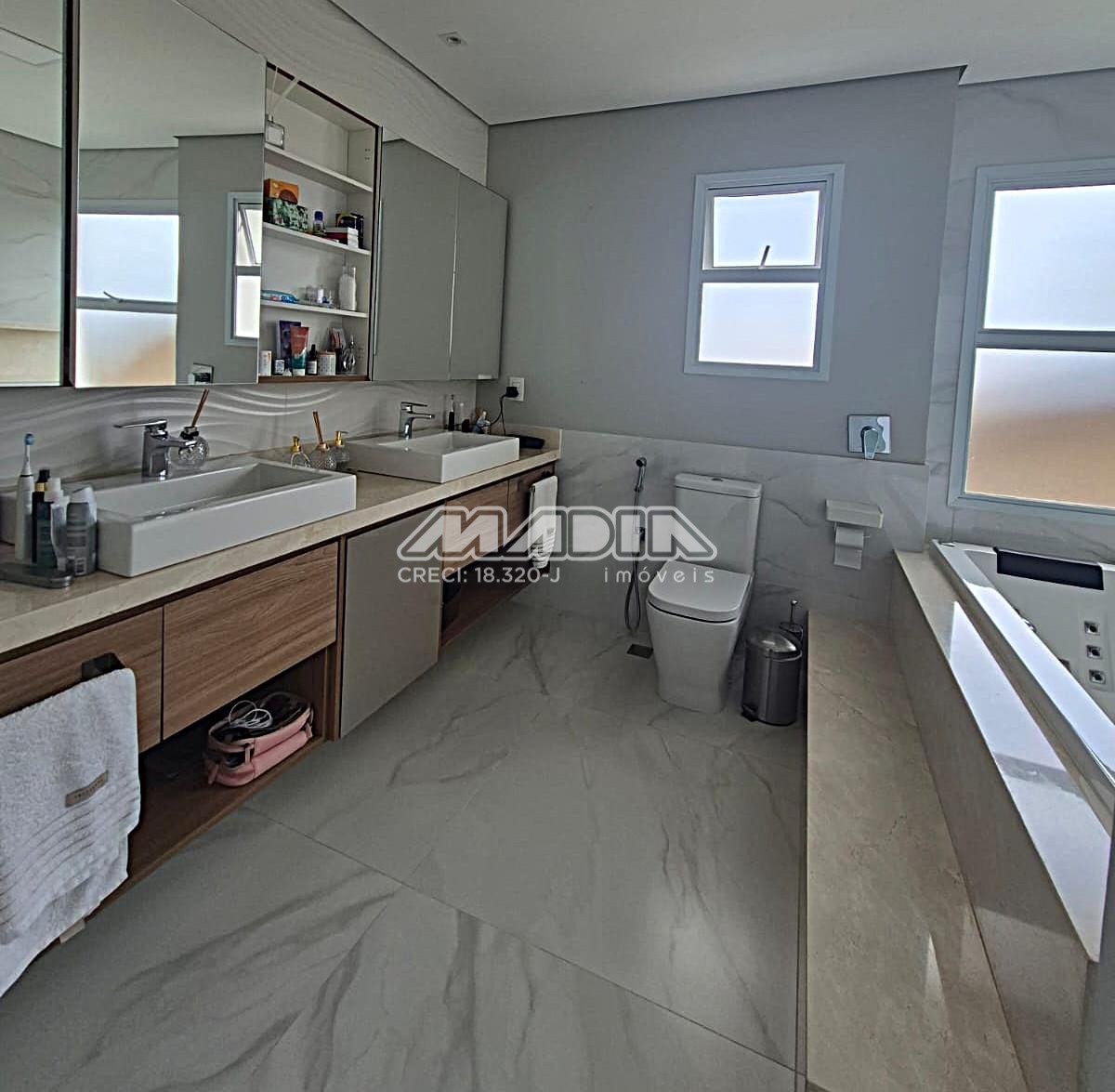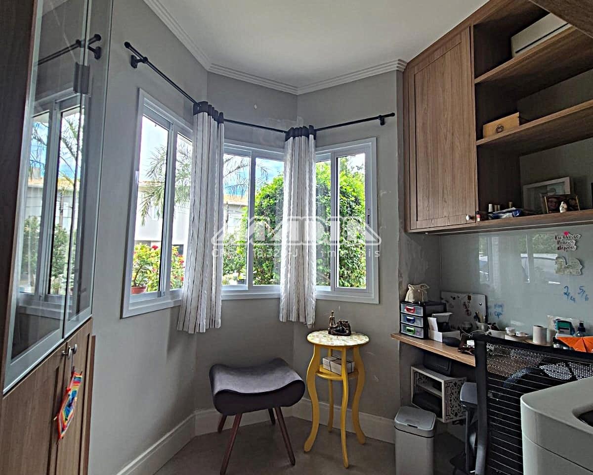 No piso superior ficam as 3 suítes espaçosas, sendo a suíte máster com closet e banheira de hidromassagem e 1 escritório, todos os dormitórios com ar-condicionado e banheiros com elegantes móveis planejados, onde fica também uma sala de TV ou quarto de hóspedes com móvel planejado de excelente qualidade, banheiro social.