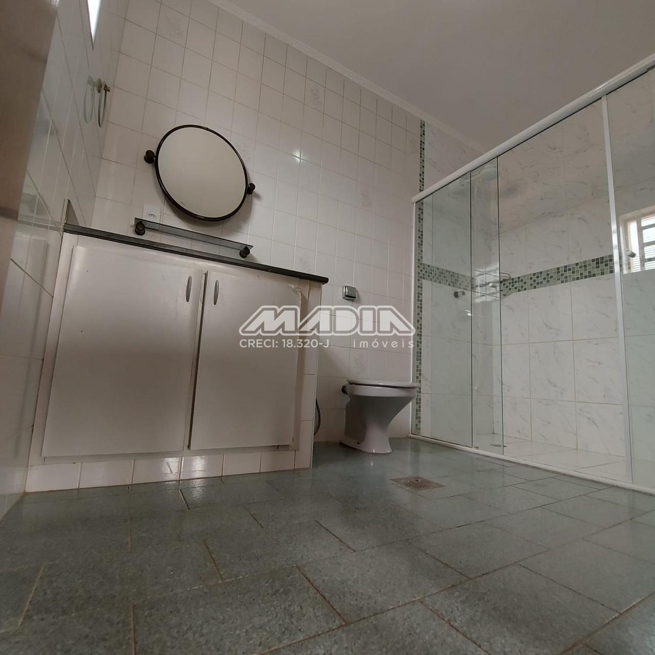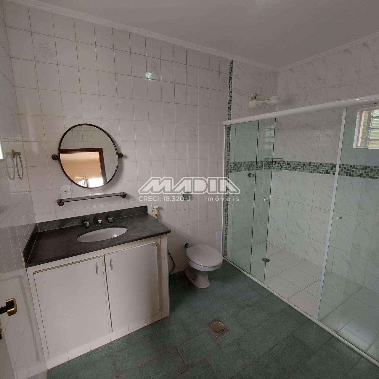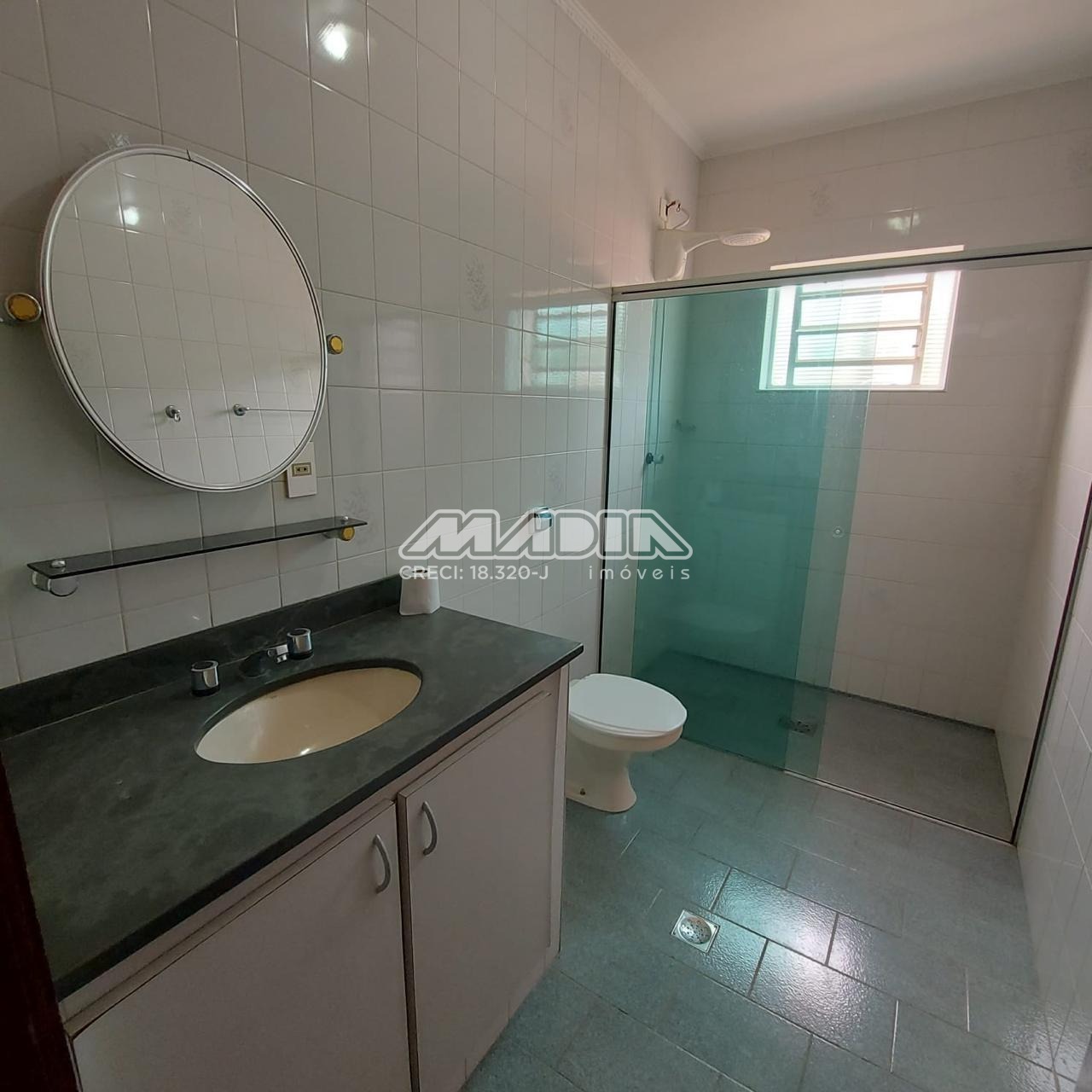 o 2 banheiros sociais com box de vidro e gabinetes