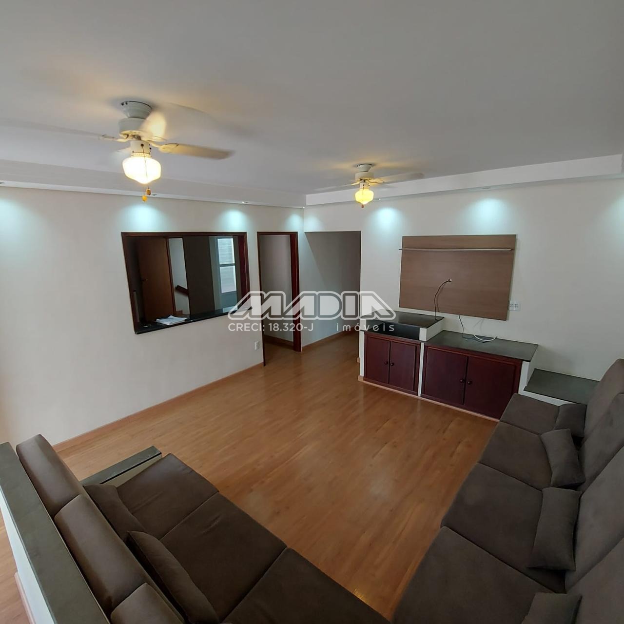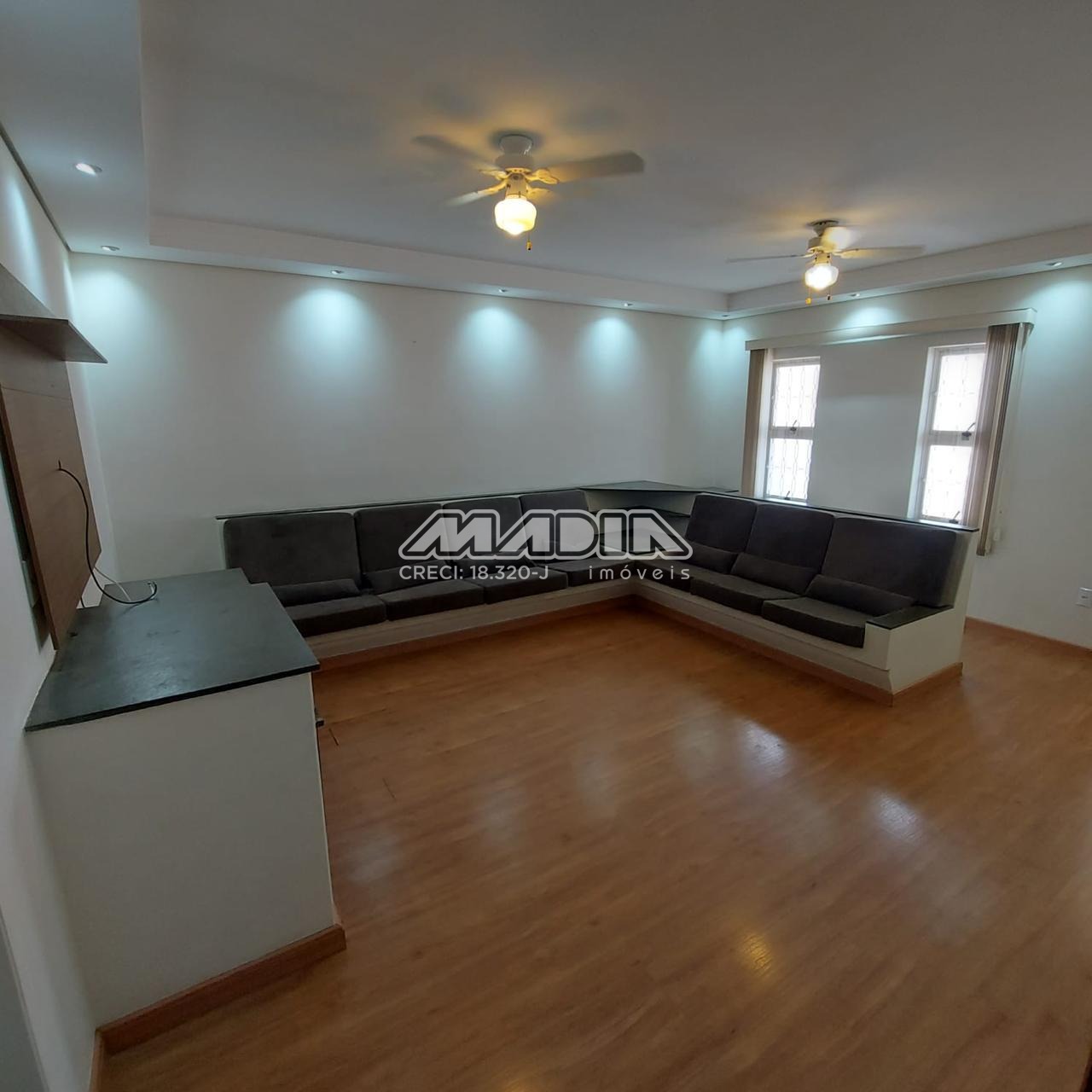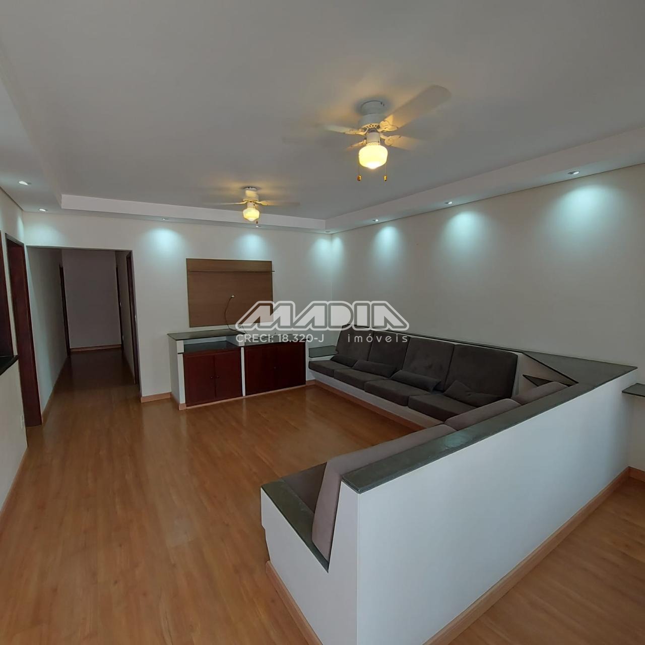 o Sala de estar com sanca de gesso e sofá em alvenaria, piso laminado