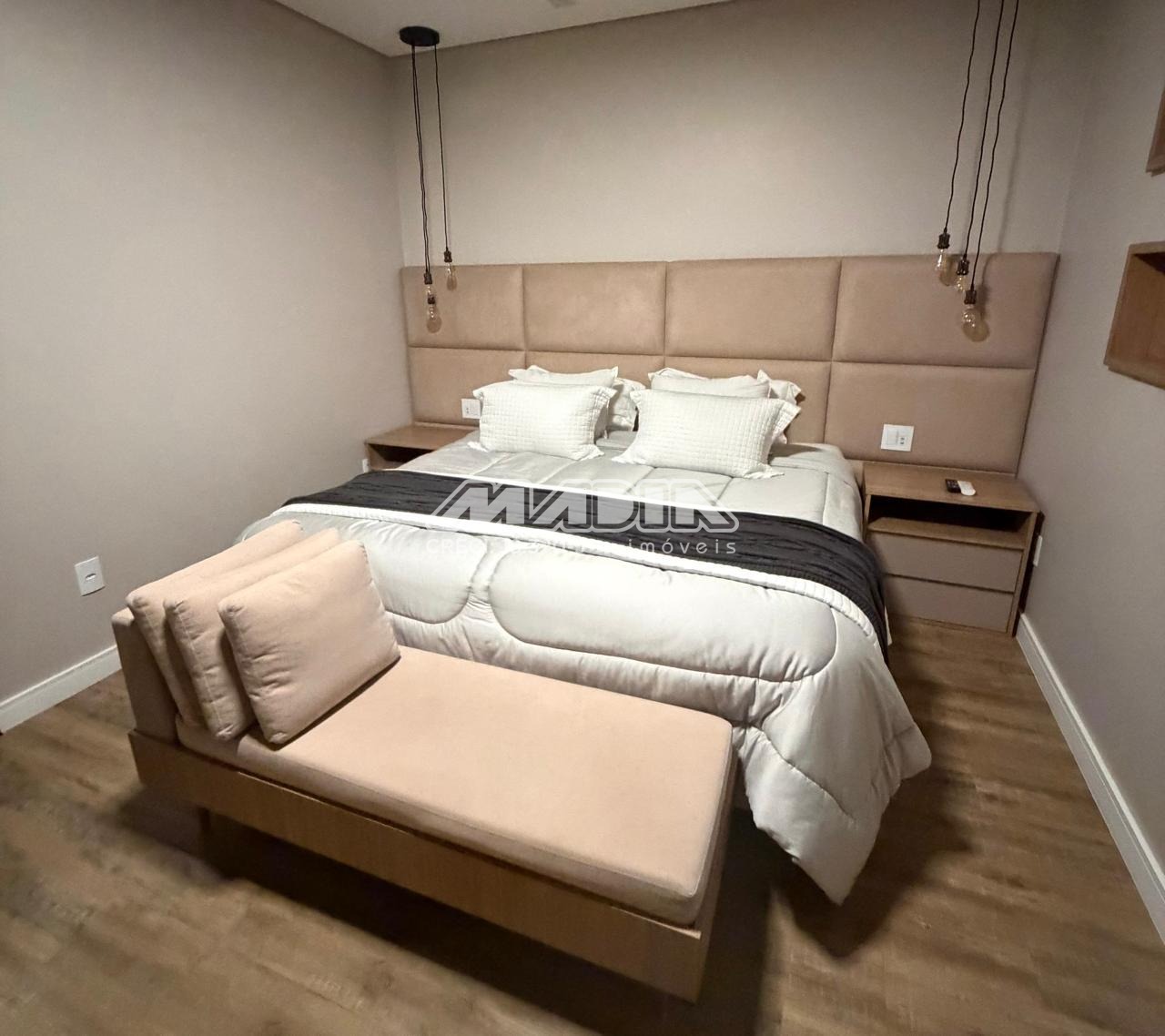 No pavimento íntimo, três suítes climatizadas com sacada proporcionam conforto e privacidade. A suíte máster apresenta amplo closet e banheiro com bancada dupla, reforçando o padrão elevado do imóvel.