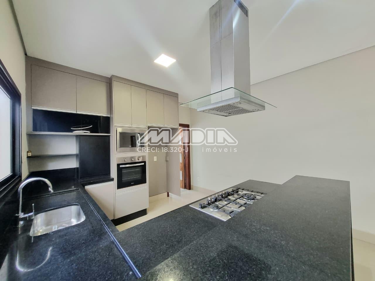 * Cozinha equipada com armários planejados, cooktop e torre com forno e micro-ondas