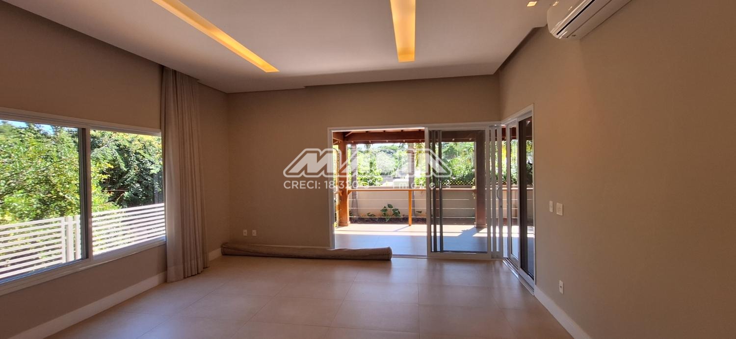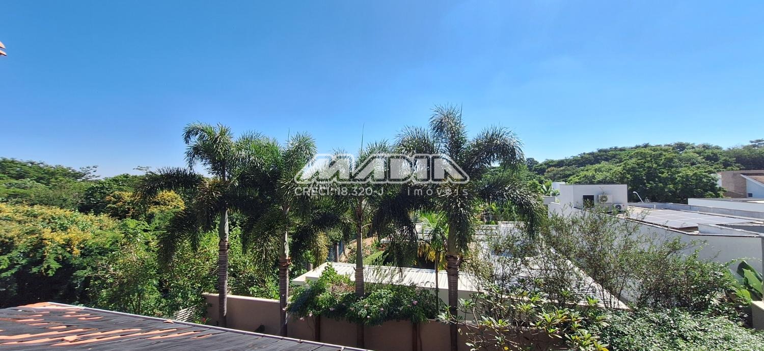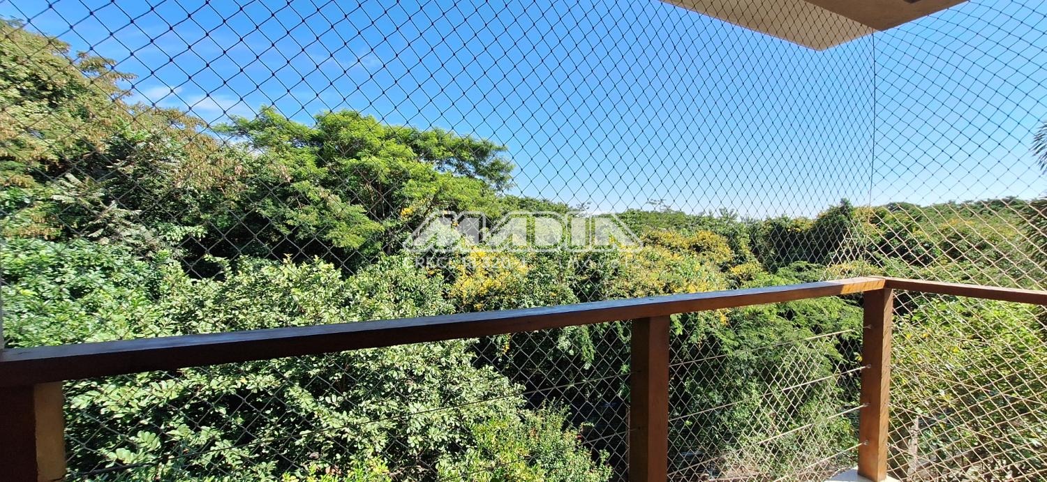 Com pé direito duplo e ampla sala de estar e sala de jantar ricamente iluminadas e a linda vista da janela para a área de preservação.