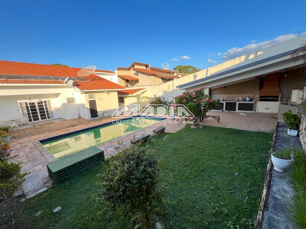 Área gourmet com piscina, churrasqueira, banheiro e despejo.