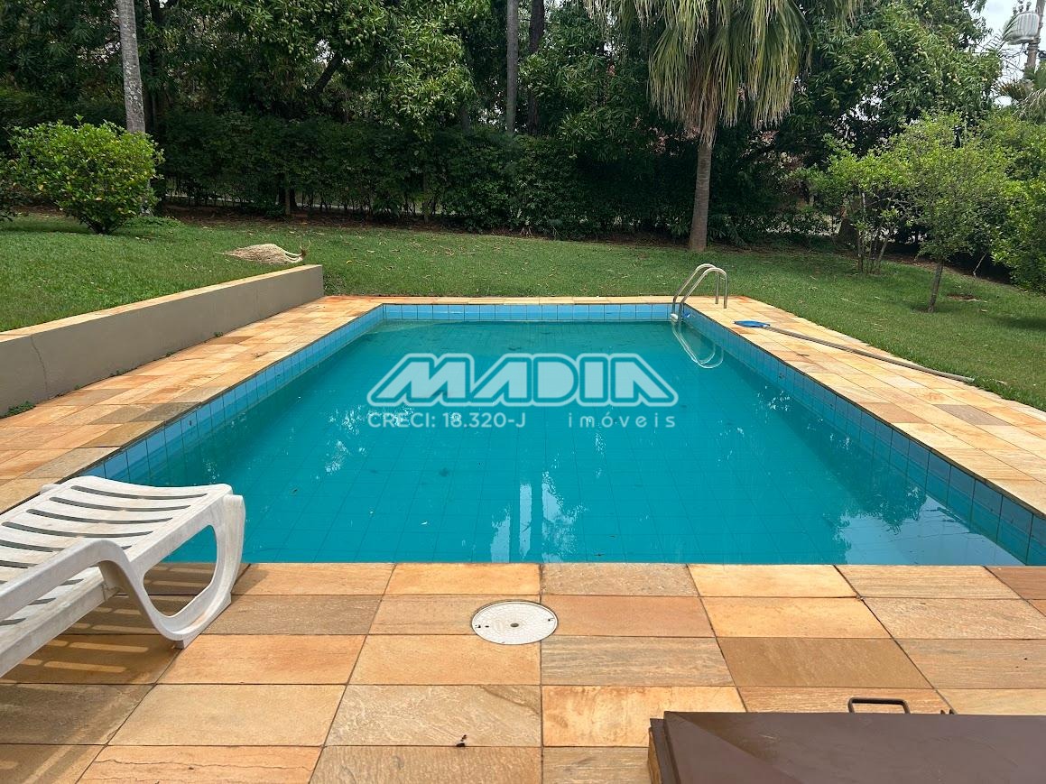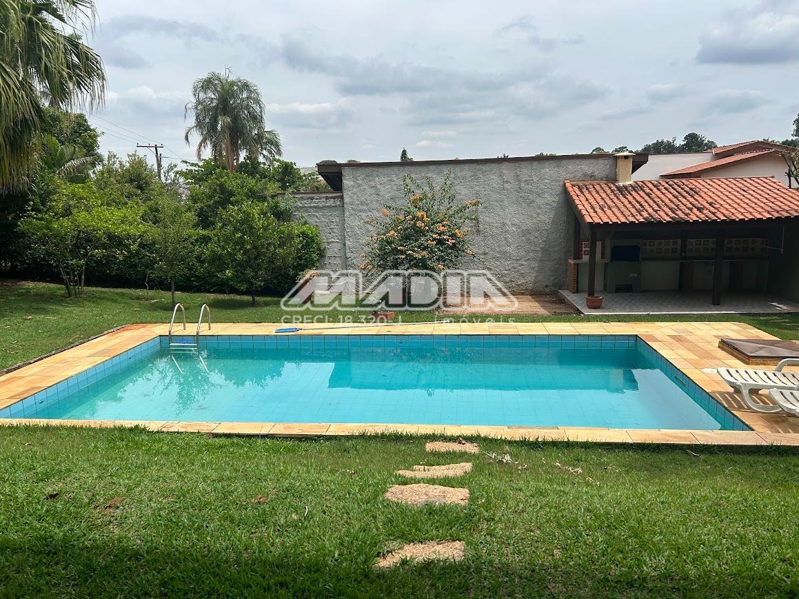 Área gourmet com churrasqueira e piscina, quintal gramado e muito verde ao redor.