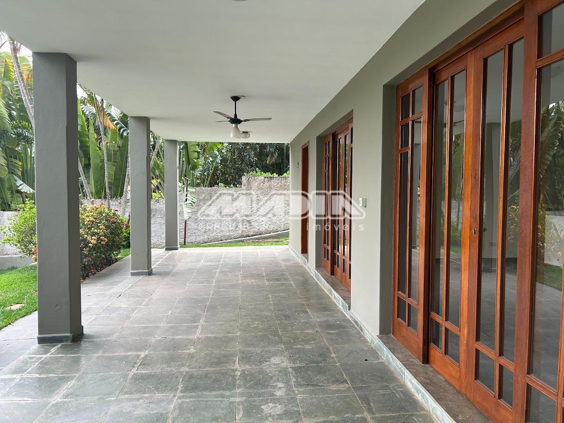 Casa assobradada com esquadrias em madeira, pé direito alto e escada de madeira, piso em cerâmica e ardósia, varanda, sacada, quintal gramado, arvores frutíferas.