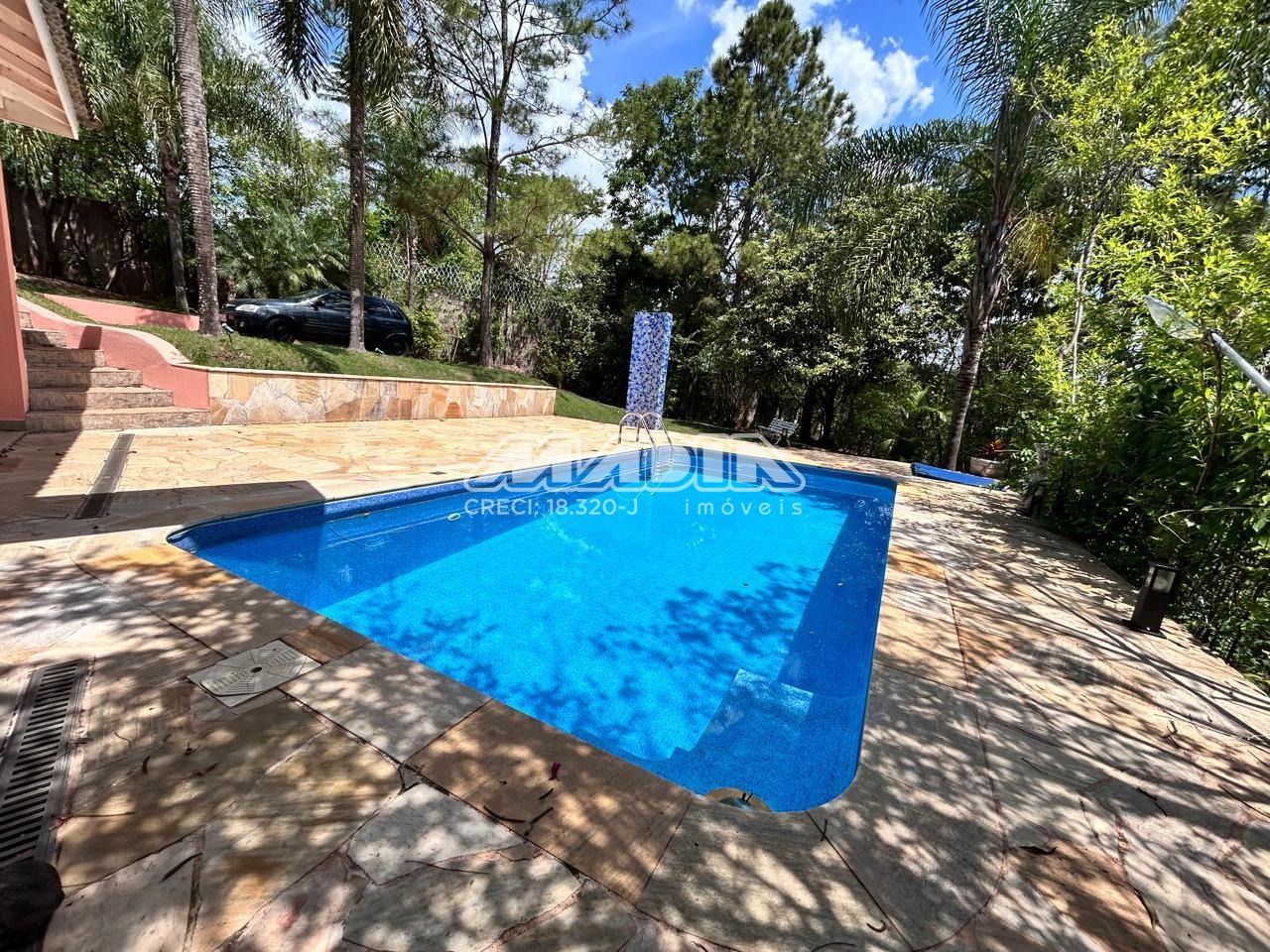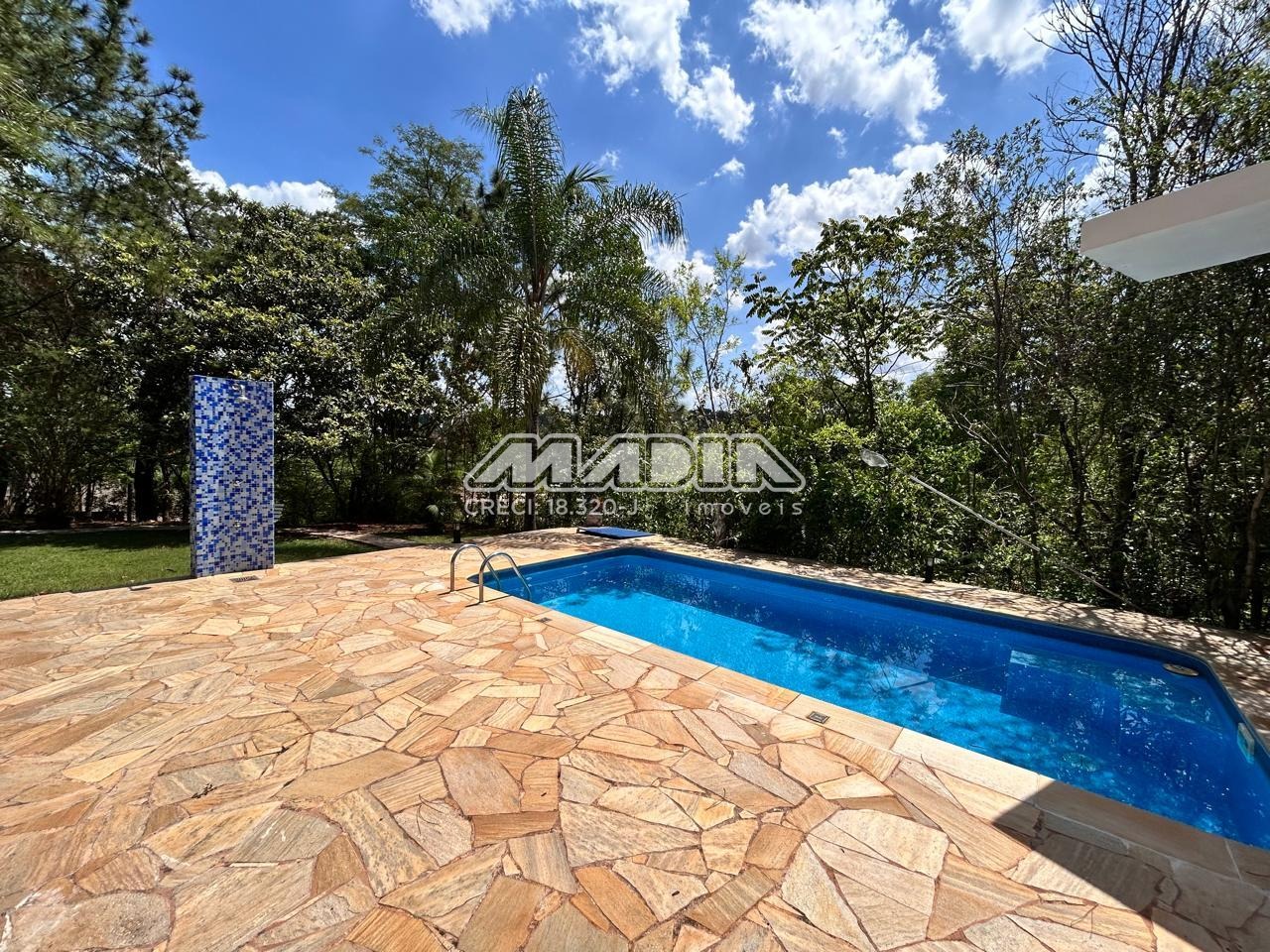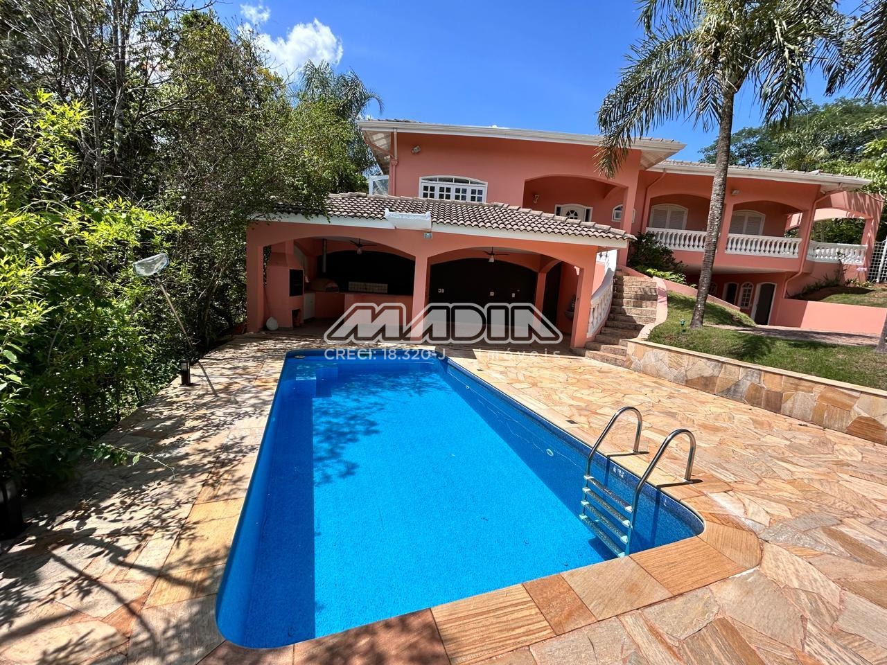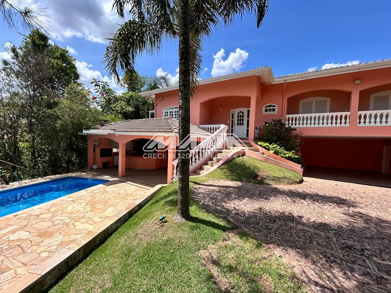 Área gourmet com churrasqueira, forno de pizza e piscina, casa toda rodeada de muito verde,