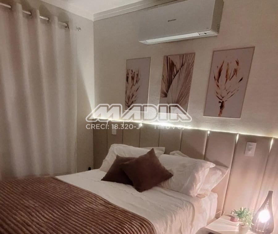 São dois dormitórios, sendo uma suíte completa de armários planejados, sendo suóte principal e dormitório solteiro, com ar condicionado, garantindo conforto térmico. O acabamento em porcelanato está presente em todo o imóvel, reforçando o alto padrão. Permanecem na casa todos os ventiladores de teto.