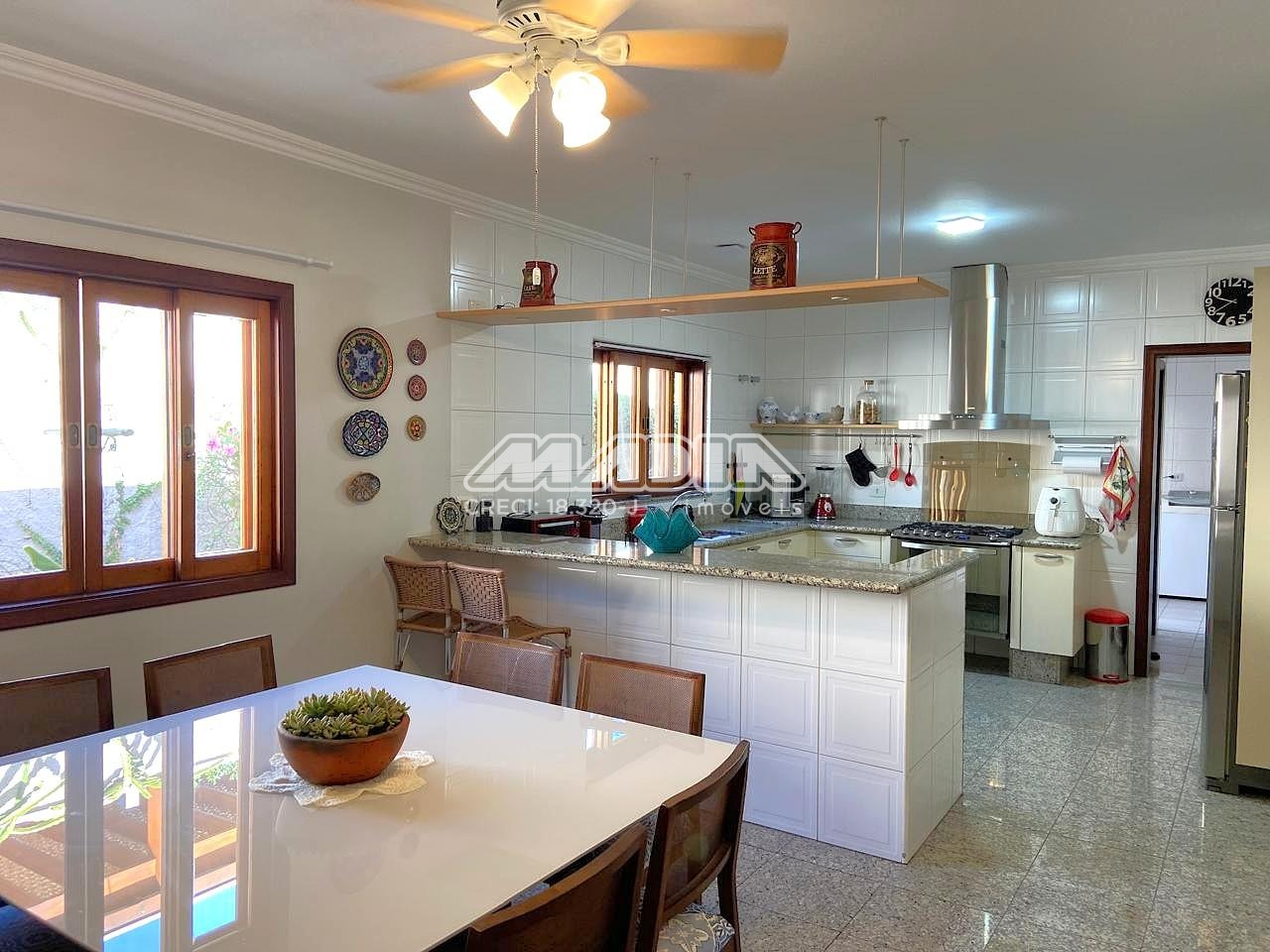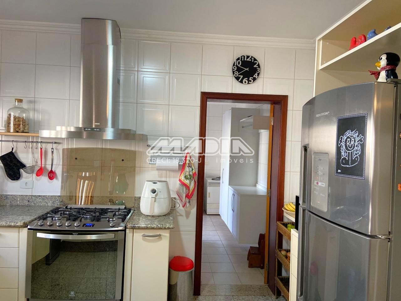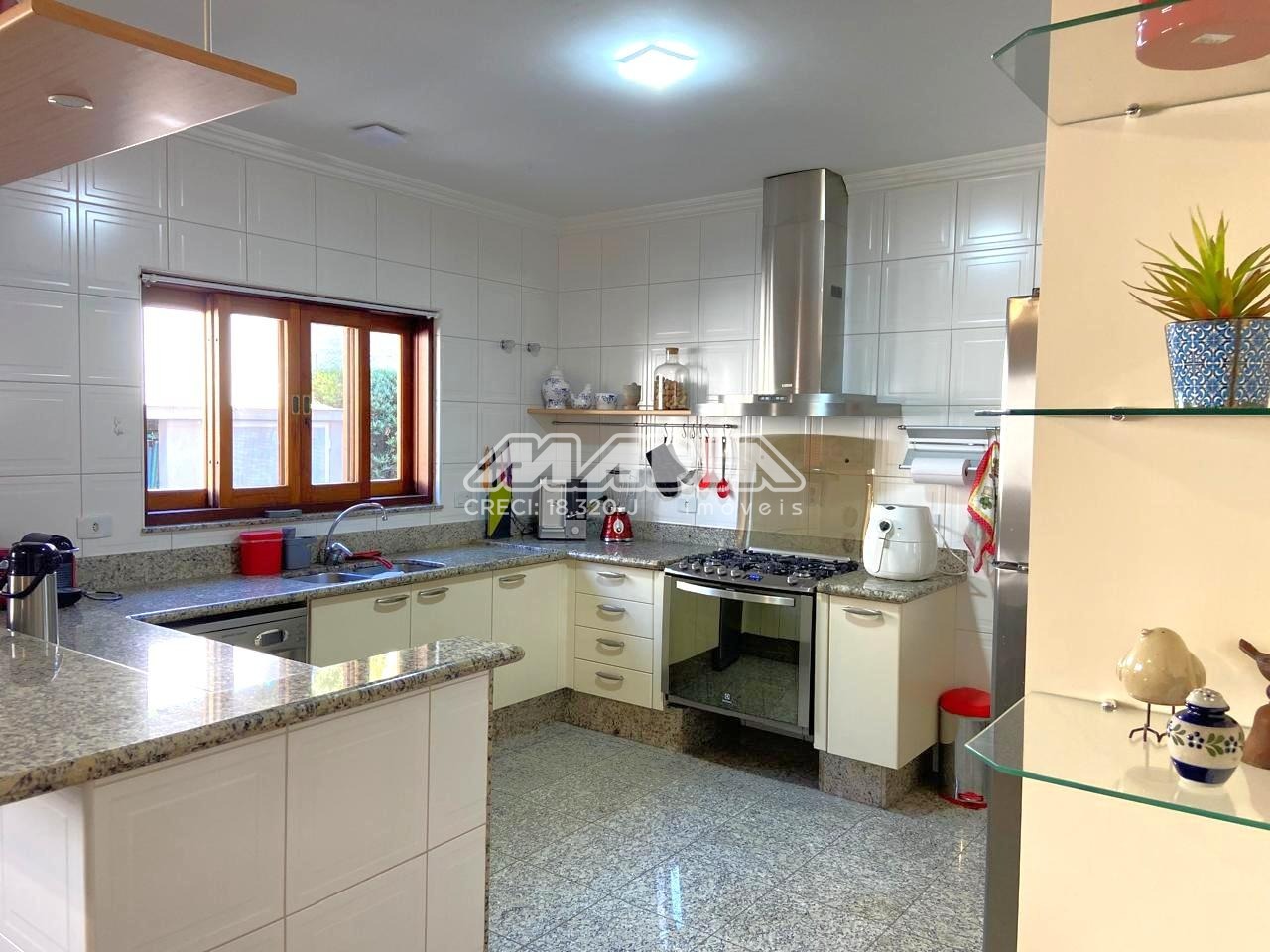 • Cozinha com armários planejados, piso e balcão em granito