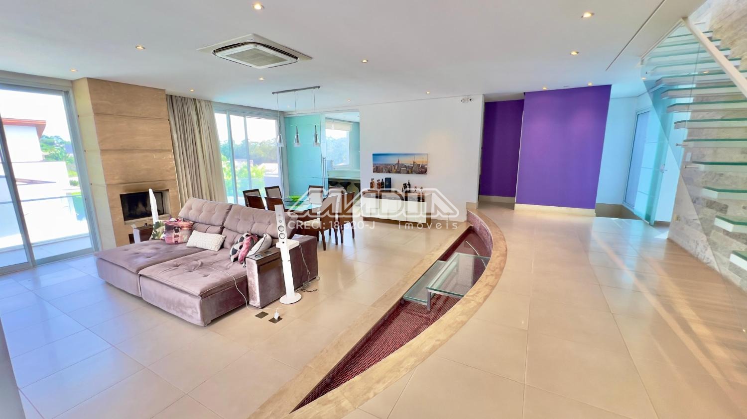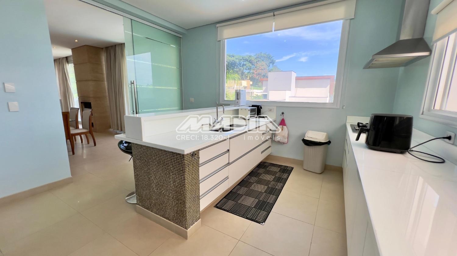 O living é um convite ao relaxamento, com salas de estar e jantar avarandadas e uma lareira aconchegante para as noites de inverno. A cozinha, digna de um chef, conta com ilha central, armários planejados de alto padrão e eletros embutidos.