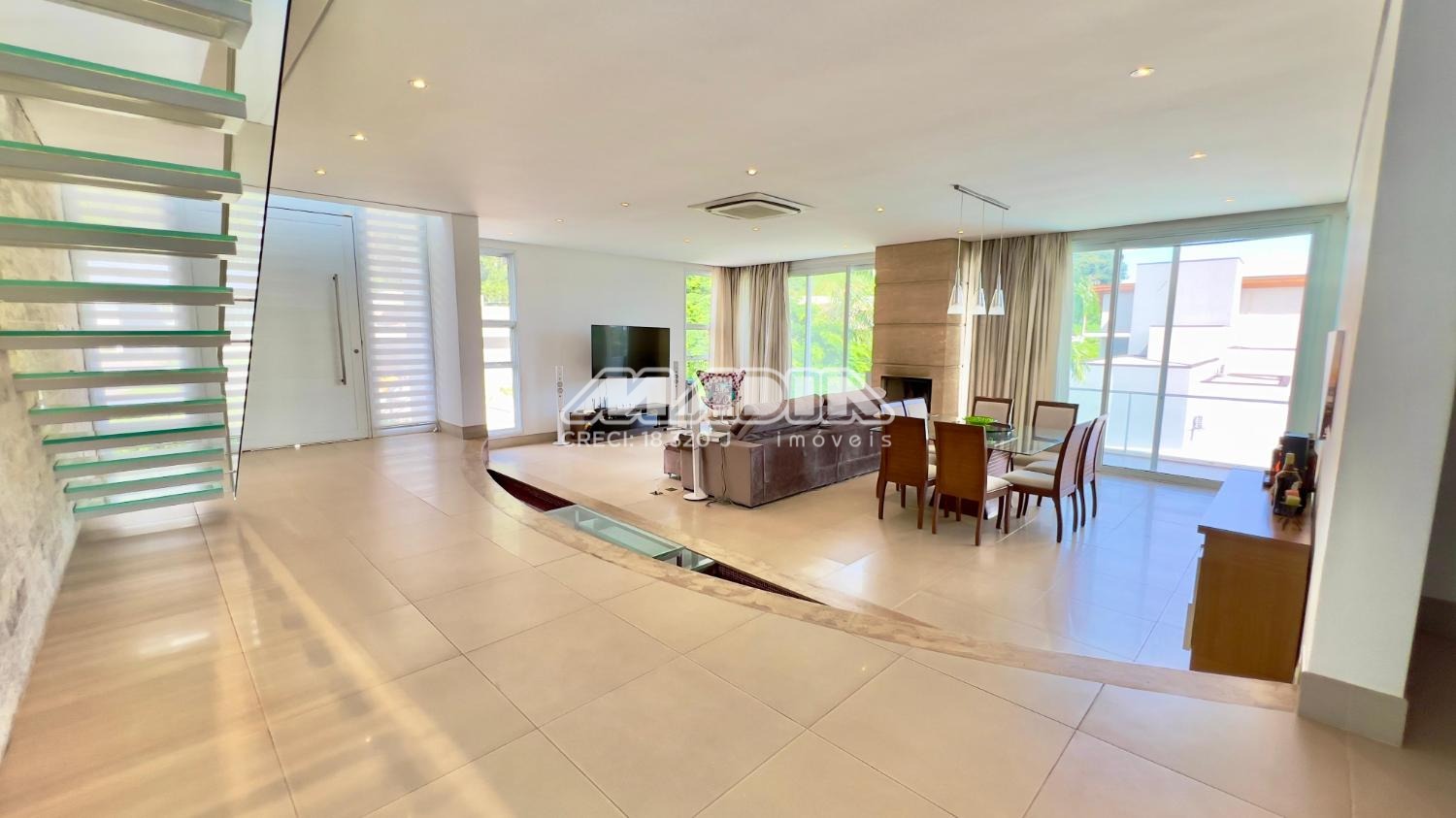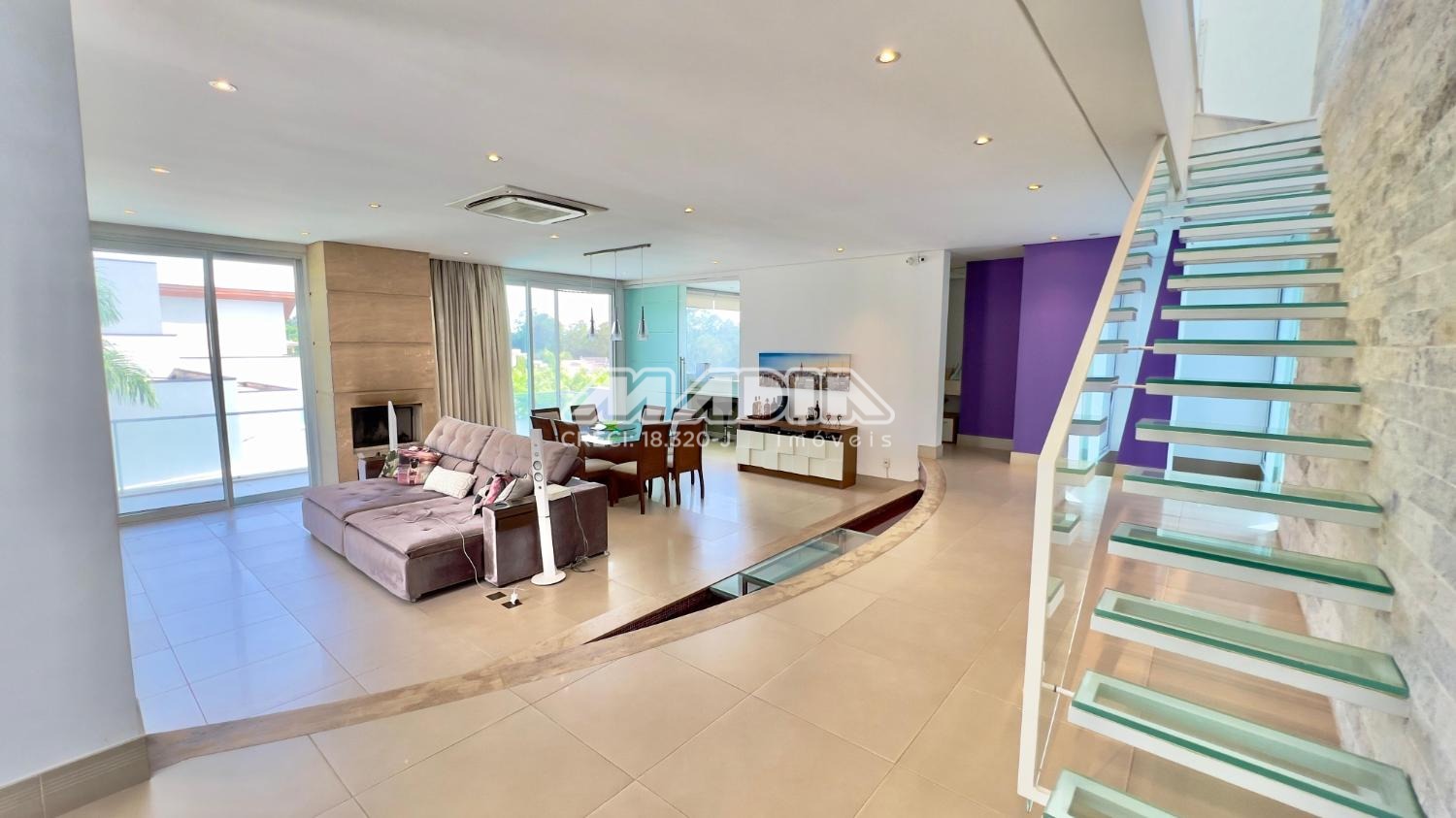 No piso superior, acessado por uma escada escultural em vidro, o mezanino oferece o home office perfeito. São 4 dormitórios (3 suítes), com destaque para a suíte máster: um verdadeiro refúgio com closet e sala de banho com hidromassagem.
