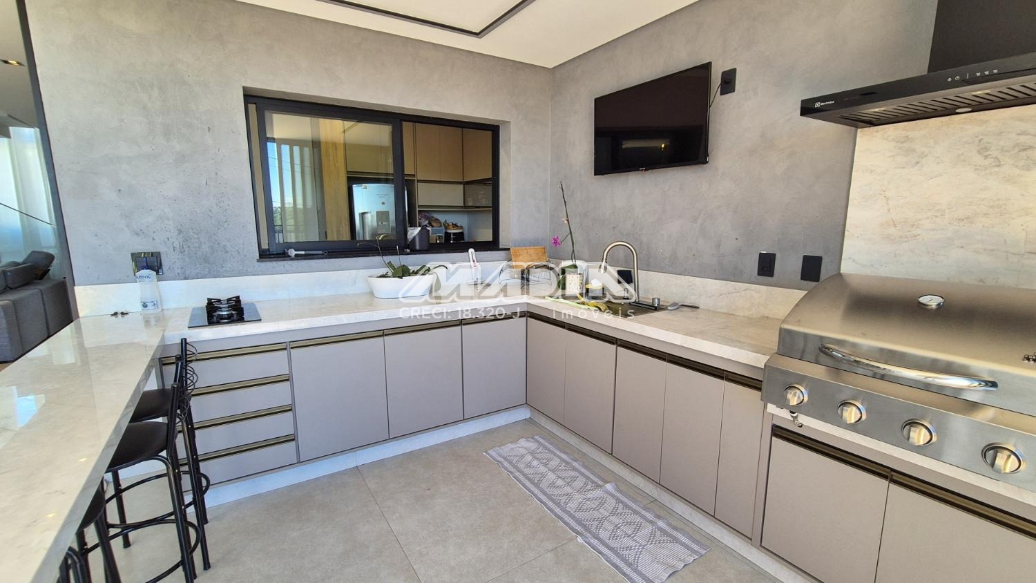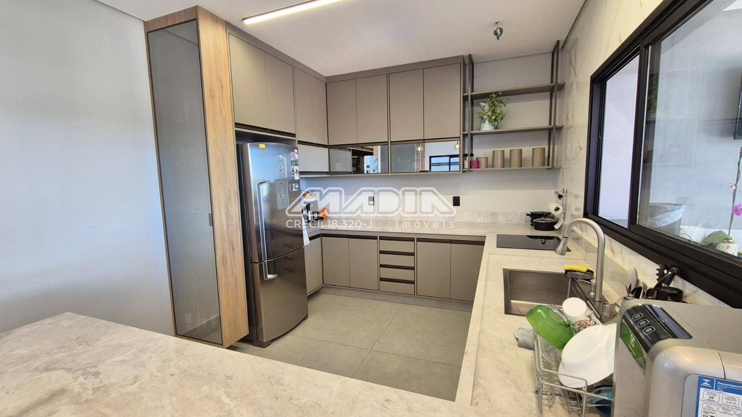 Cozinha com armários planejados, aconchegante espaço gourmet e ofurô.