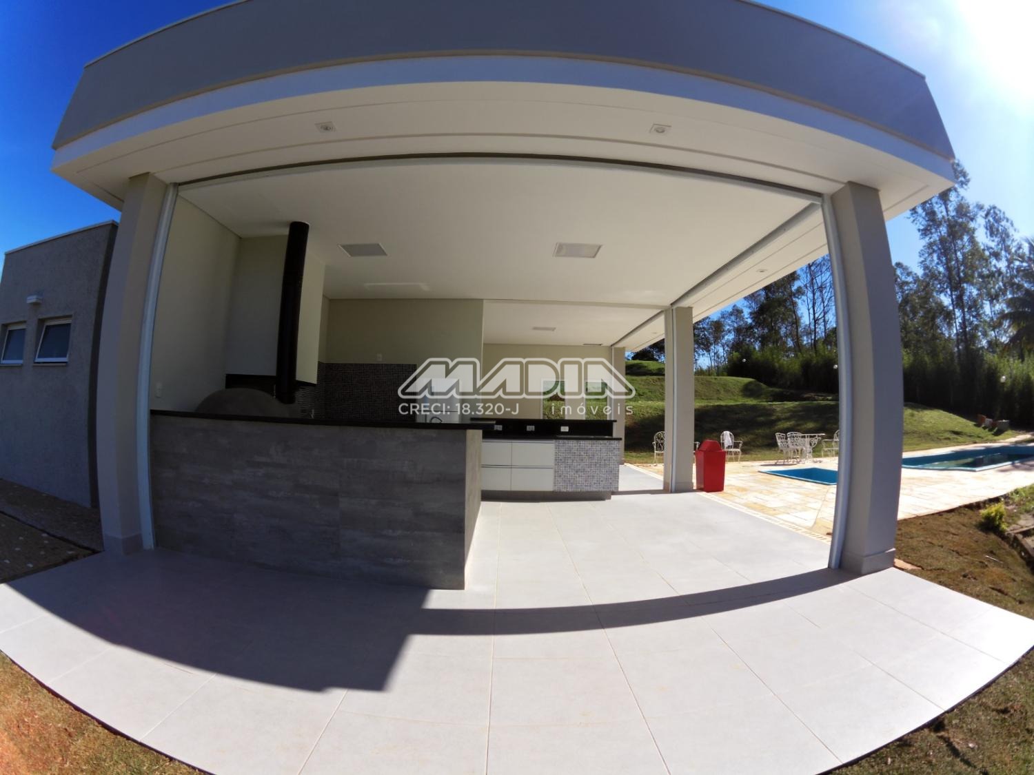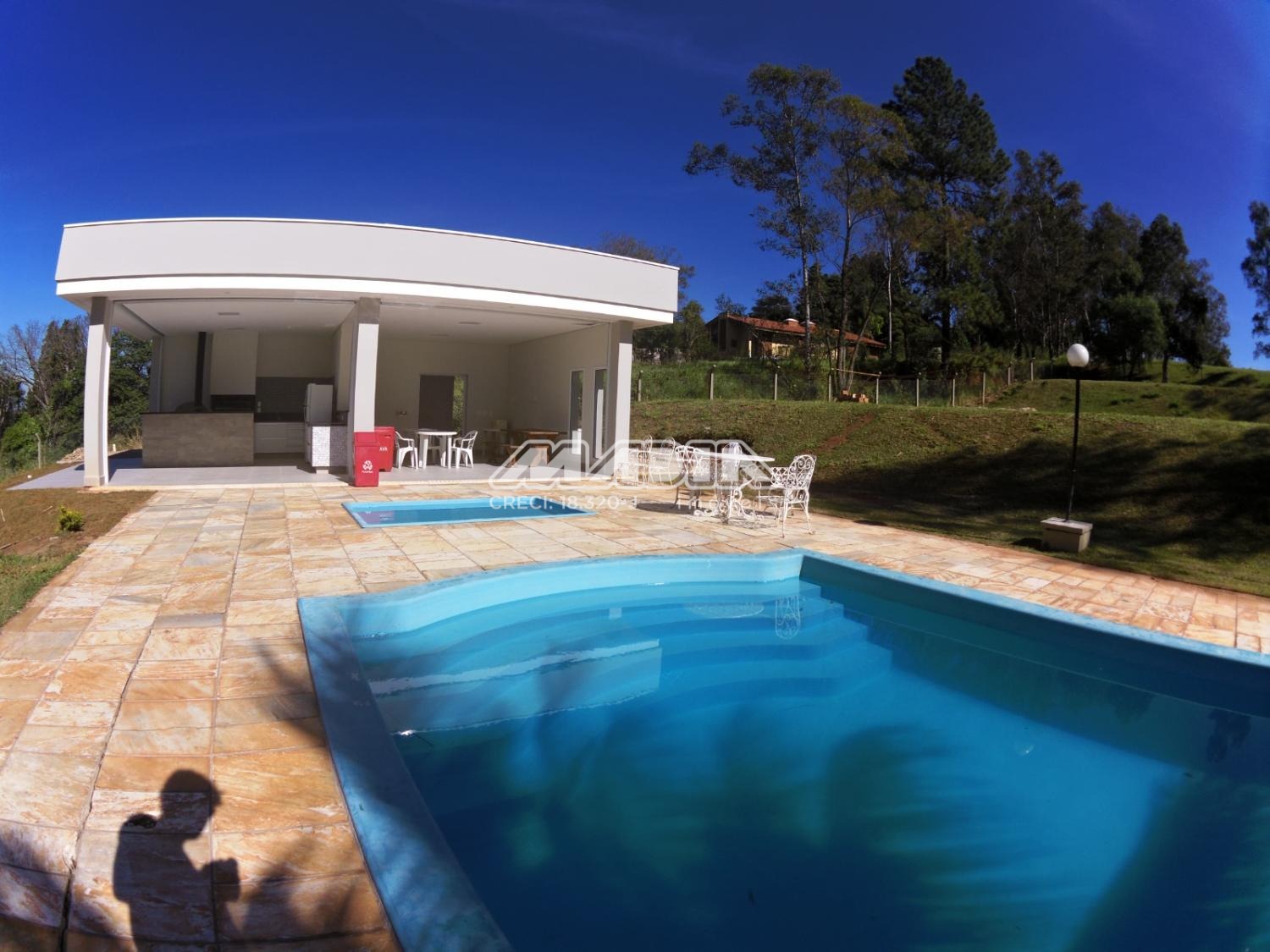 Área de lazer nova com salão de festas, área gourmet com churrasqueira, armários, piscinas (adulto e infantil) e banheiros masculino e feminino. Extensa área gramada e com arvores frutíferas.