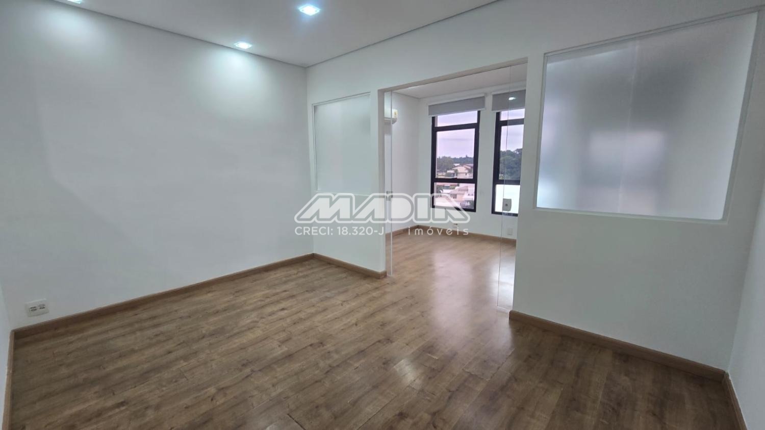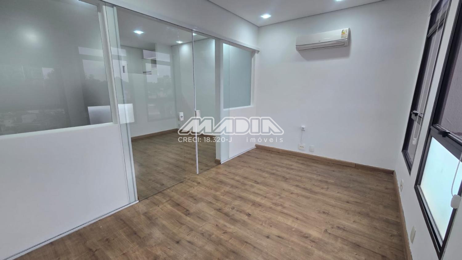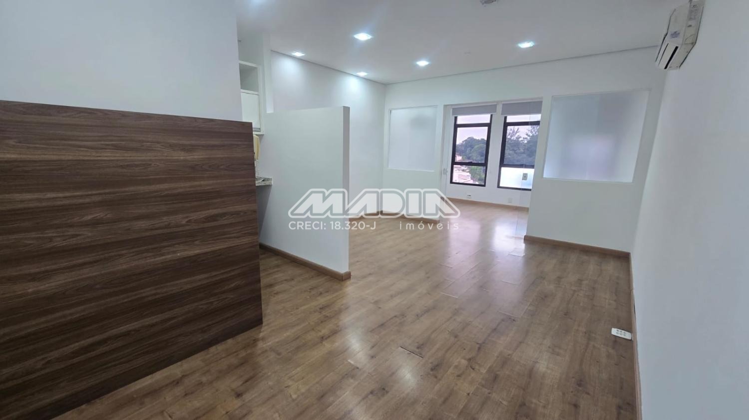 Sala para locação com 38m² de área útil, localizado no 5º andar, possui 2 ambientes e 2 aparelhos de ar-condicionado, copa com armário e um banheiro. Acabamento em piso laminado. A sala tem direito de uma vaga de garagem não demarcada, podendo ser coberta ou descoberta.