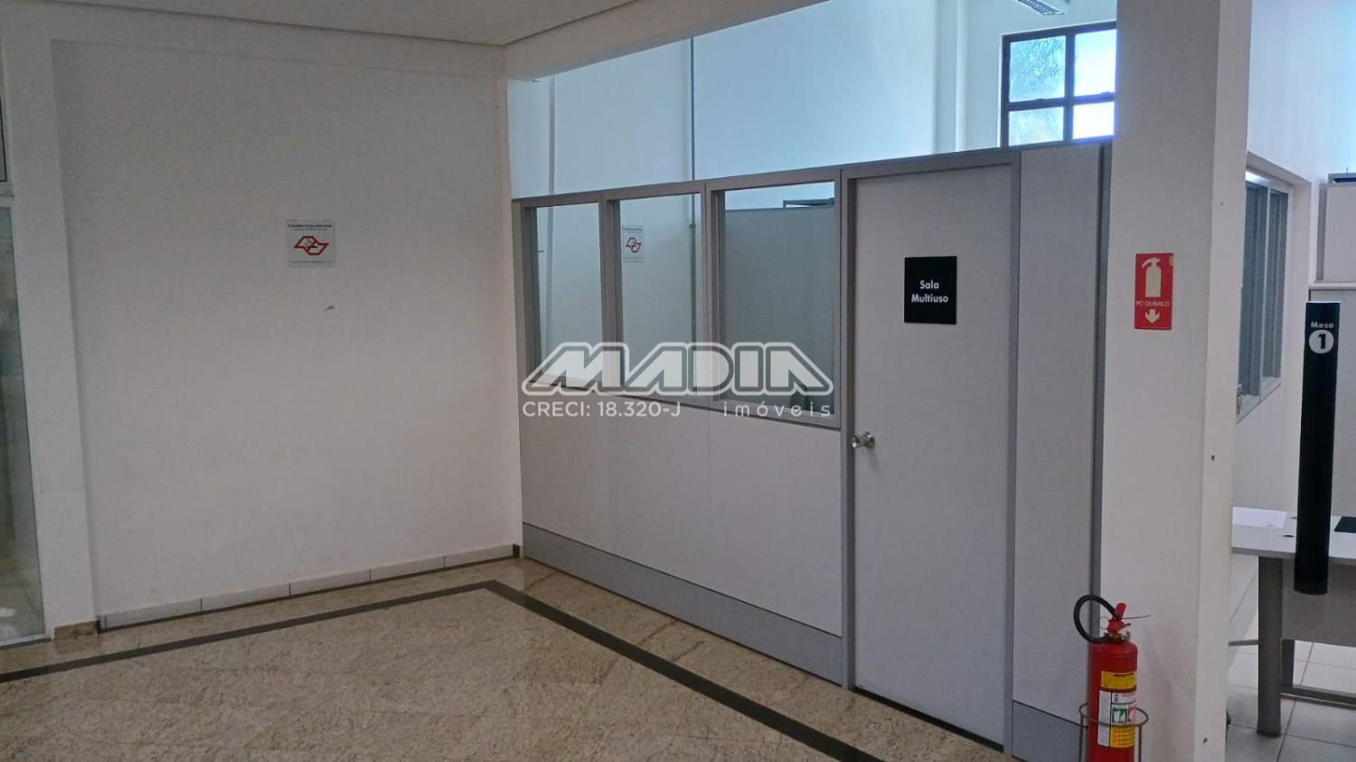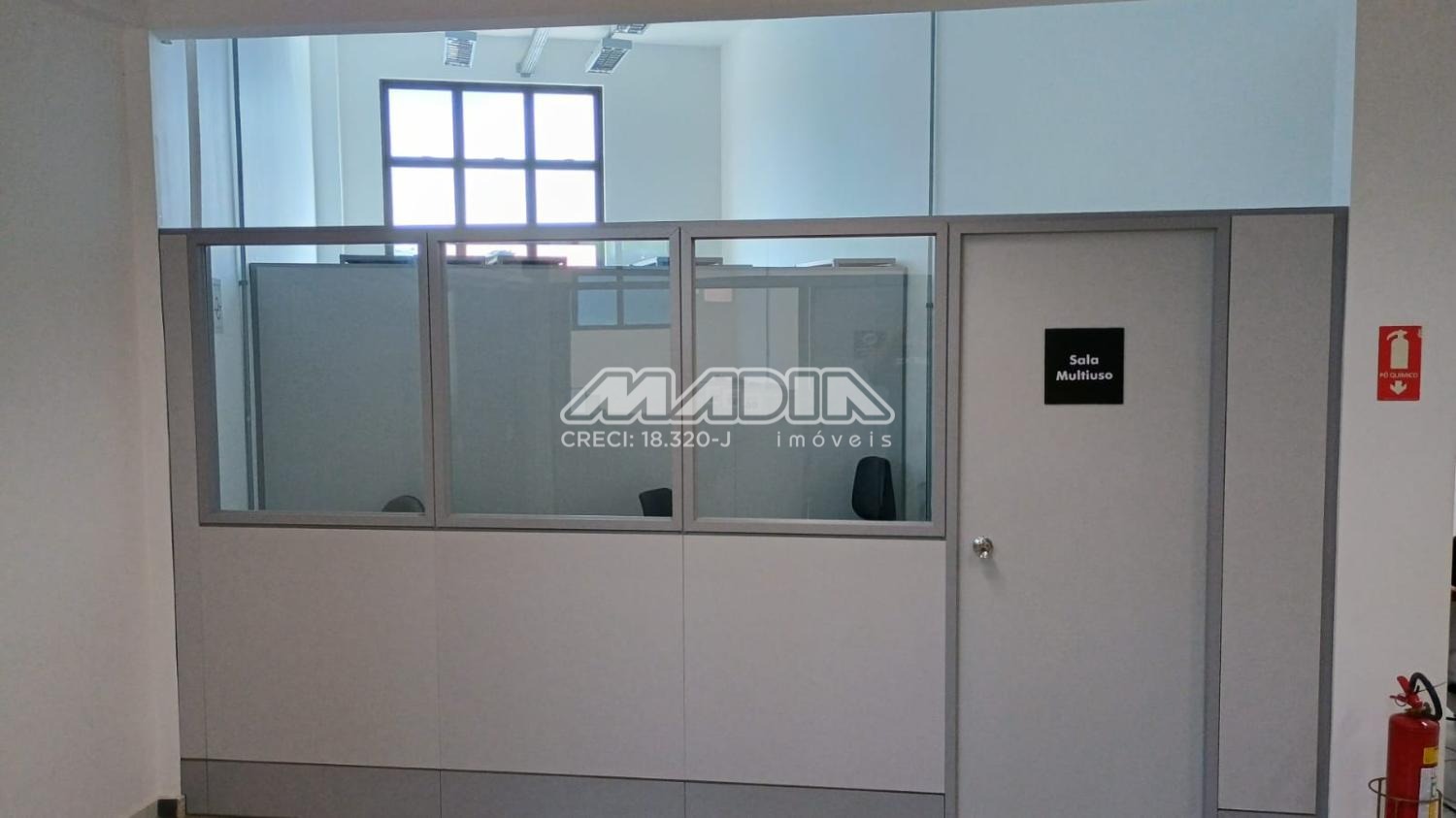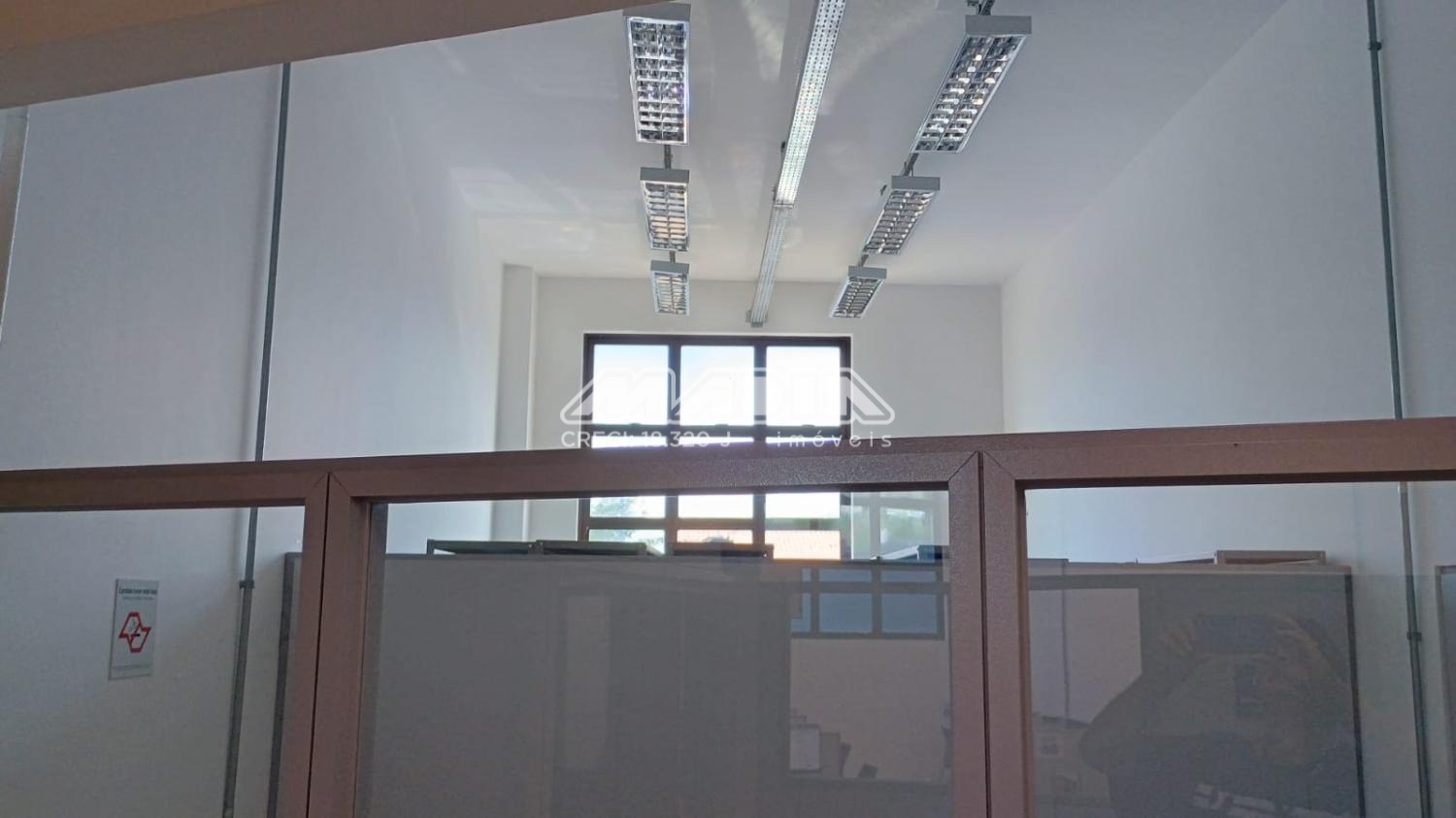 A sala contem 34,05 m², com piso laminado, com 4 mesas, cadeiras, ar condicionado, luminárias, divisória de vidro, cozinha com pia, armários, pronta para ser usada.