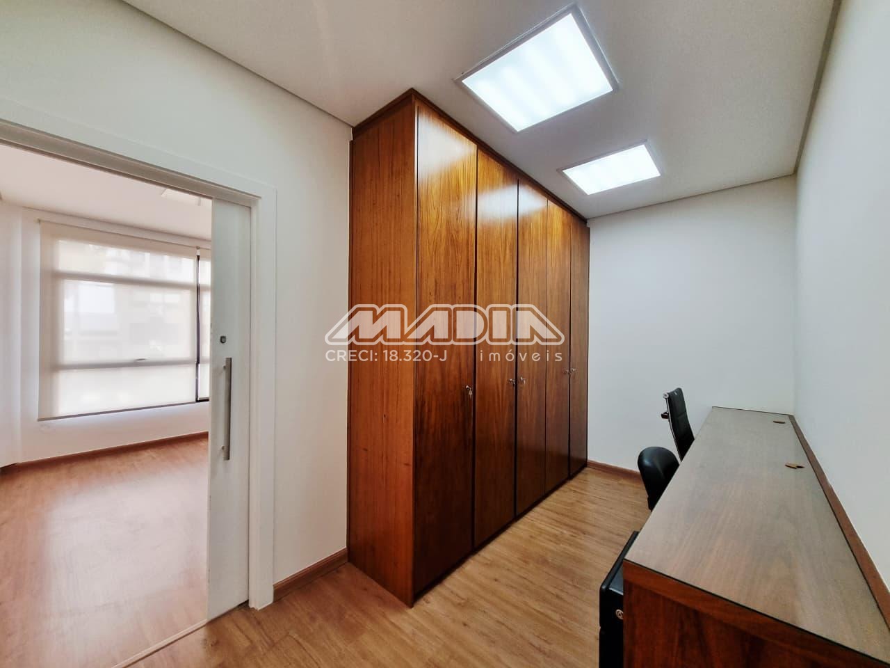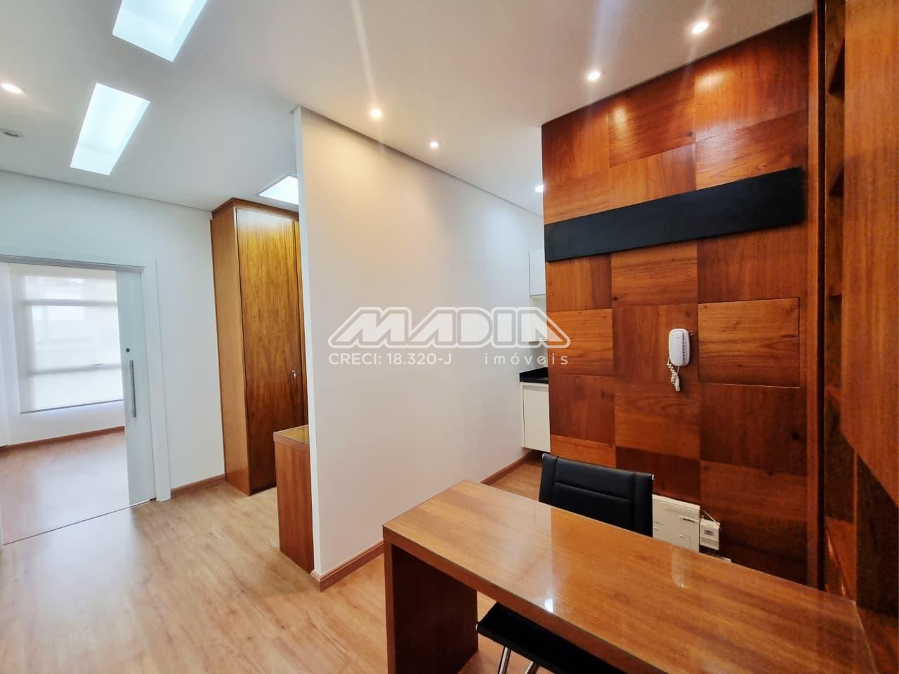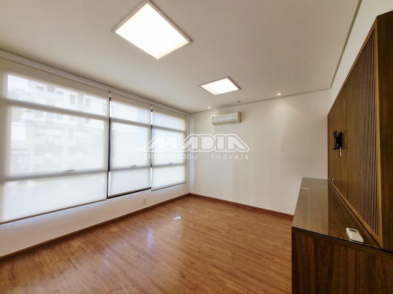 Sala de 38,56m², 3 salas com armários, mesa, painel, 1 banheiro, ar condicionado, piso laminado, 1 vaga de garagem rotativa