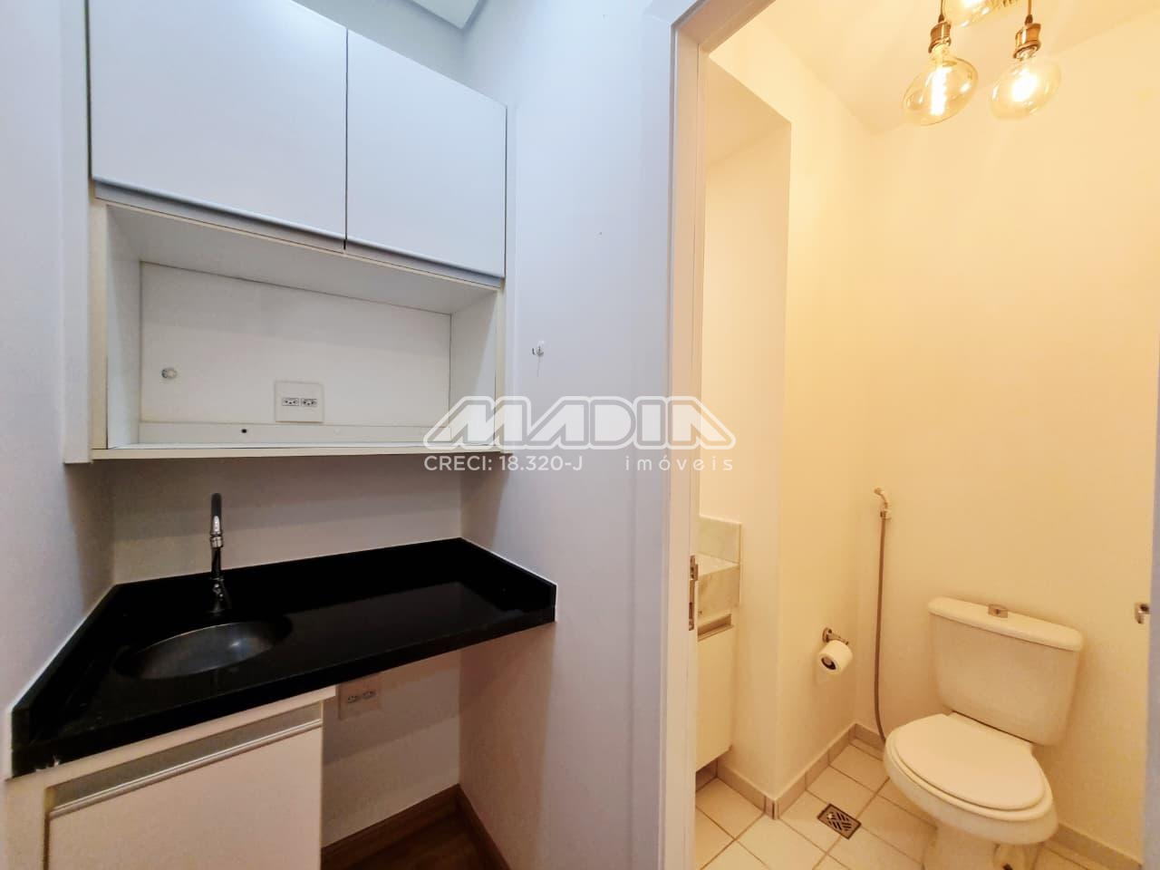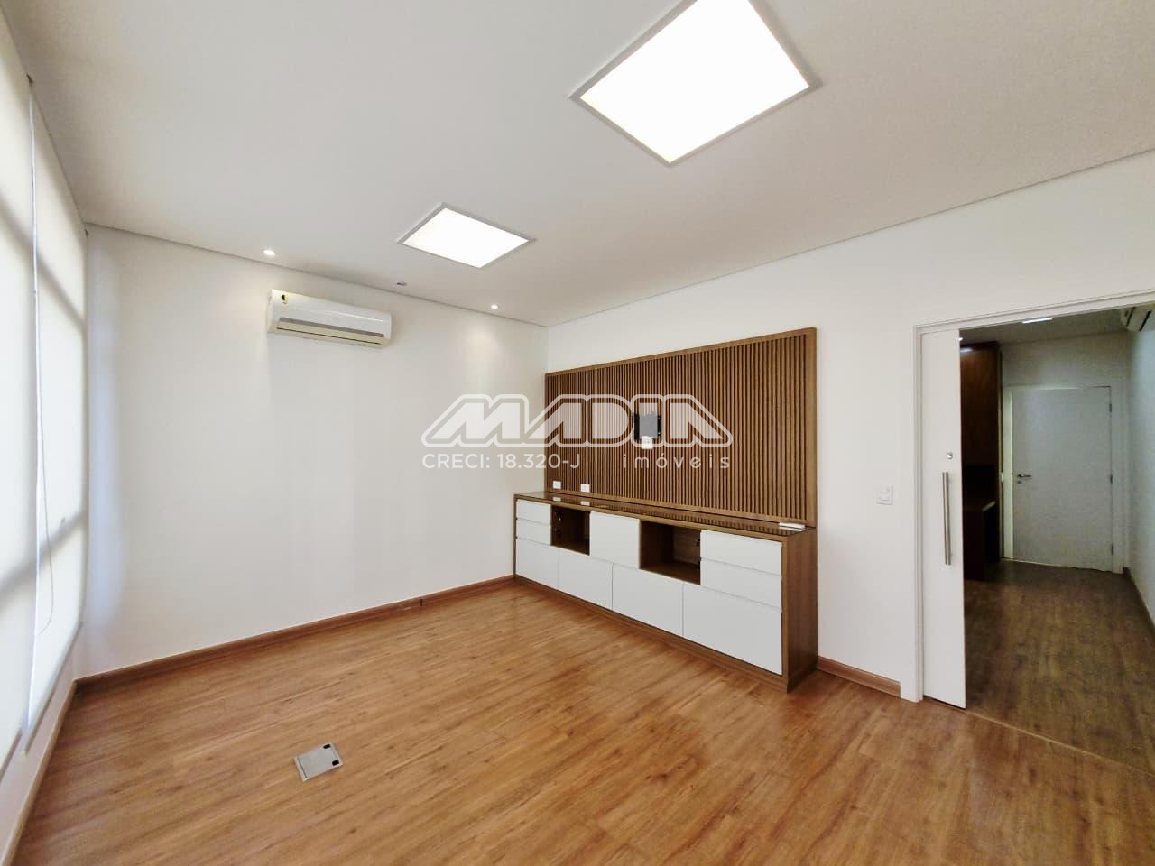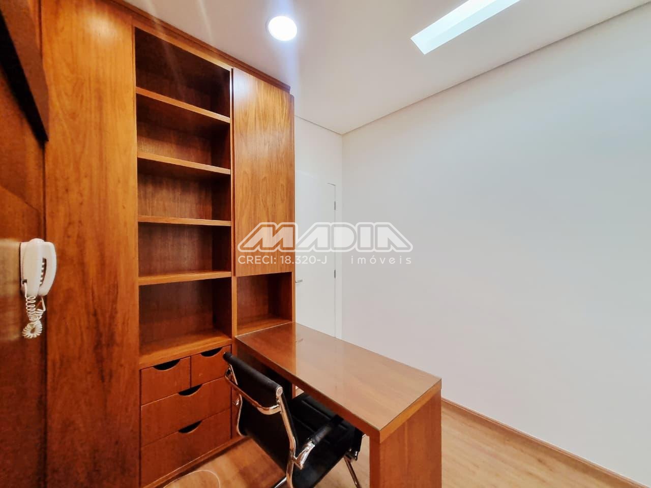 Sala de 38,56m², 3 salas com armários, mesa, painel, 1 banheiro, ar condicionado, piso laminado, 1 vaga de garagem rotativa